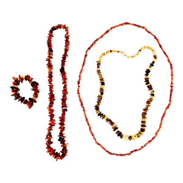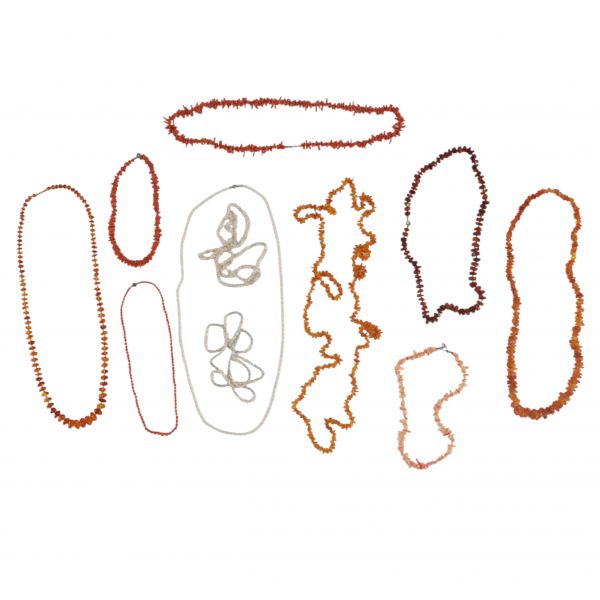 İnci kolyelerden birinin bağlantı kısımı 14 ayar altındır. Mercan ve kehribar kolyelerin bağlantı kısımları altın kaplama ve gümüştür.