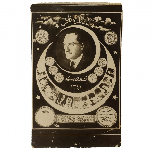 Hasan Sabri Bey tarafından 1925 yılında hazırlanıp yayınlanan ve Gazi´ye duyulan minnetin "Kurtardın vatanı, oh, Mustafa Kemal" ifadeleriyle samimi bir şekilde dile getirildiği kartpostalda, Mustafa Kemal Paşa başta olmak üzere Milli Mücadele´ye büyük katkılarda bulunan şu isimlerin görselleri yer almaktadır: Halid Paşa, Kemaleddin Sami Paşa, Nureddin Paşa, Kâzım (Özalp) Paşa, Ali İhsan Paşa, Kâzım (Karabekir) Paşa, İsmet Paşa, Fevzi Paşa, Muhiddin Paşa, Refet Paşa, Cafer Tayyar Paşa, Cevat Paşa, Selahaddin Adil Paşa. *Kartın sağ alt köşesinde kırık, orta üst bölümünde ise iğne deliği mevcuttur.