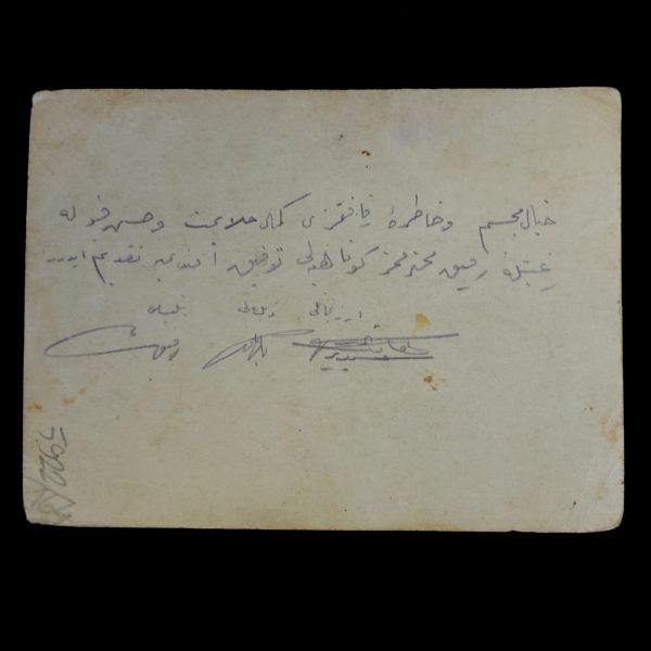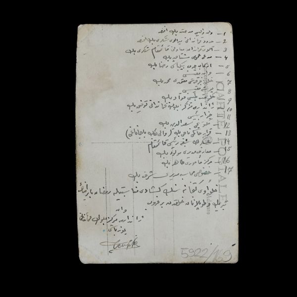 Arka yüzüne eski harflerle fotoğrafta bulunanların isimleri ve tarih-mekan bilgisi not düşülmüştür: "1- Kolordu Baş Baytarı Miralay Kâmil Beyefendi 2- Mevki İnşaat İstihkâmiye Komisyonu Reisi Miralay Abdullah Beyefendi 3- Kolordu Levazım 2. Kısım Âmiri Binbaşı Salim Beyefendi 4- Mevki Daire Müdürü Yüzbaşı Tevfik Bey 5- Kolordu Muhasib-i Mesulü Tahsin Bey - 8.6.933 (?) Köyü, Erzurum - Mevki Karargâhı bağçesi."