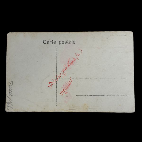 Arka yüzüne eski harflerle fotoğrafta bulunanların isimleri ve tarih-mekan bilgisi not düşülmüştür: "1- Nakliye Müfettişi Hayri Paşa Hazretleri 2- Üçüncü Kolordu Nakliye Taburu Kumandanı Binbaşı Mukbil Beyefendi 3- İkinci Bölük Kumandanı Kıdemli Yüzbaşı Kâmil Bey 4- Tabur Emir Zabiti Yüzbaşı İbrahim Bey 5- İkinci Bölük Takım Zabiti Yüzbaşı İbrahim Bey 6- İhtiyat Zabit Vekili Parnaslı İhsan Bey 7- İhtiyat Zabit Vekili 8- İhtiyat Zabit Vekili Ekrem Bey 9- İhtiyat Zabit Vekili Tevfik Bey 10- Birinci Mülazım Tevfik Bey 11- İhtiyat Zabit Vekili Nezir Bey 12- İhtiyat Zabit Vekili Fuad Bey 13- Nakliye Küçük Zabit Mektebi Muallimlerinden Birinci Mülazım Sırrı Bey 14- İhtiyat Zabit Vekili Adnan Bey (üzeri karalanmıştır) 15- Nakliye Küçük Zabit Mektebi Muallimlerinden Birinci Mülazım Remzi Bey 16- Başçavuş Emin Efendi... - İstanbul Nakliye Taburu hatırası, 929"