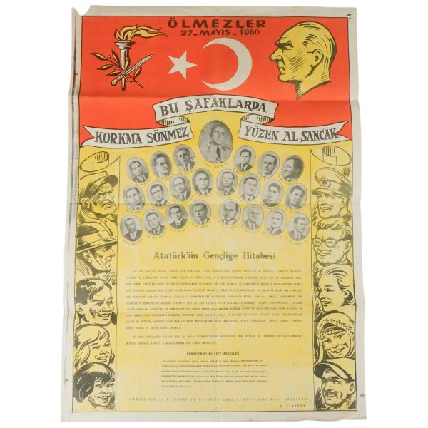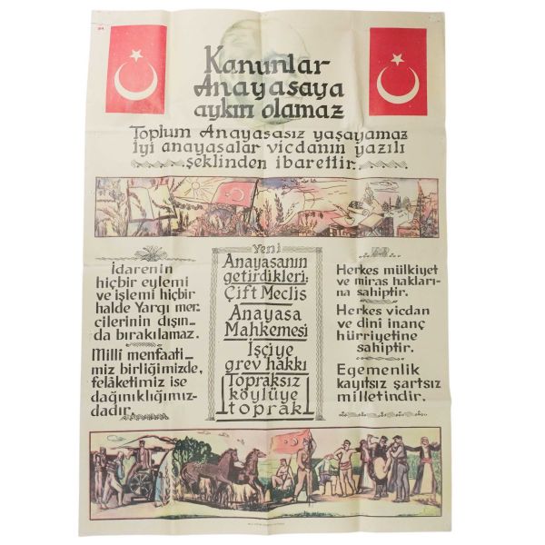 Afişte yazan metin: "Kanunlar Anayasaya aykırı olamaz / Toplum Anayasasız yaşayamaz / İyi anayasalar vicdanın yazılı şeklinde ibarettir... - İdarenin hiçbir eylemi ve işlemi hiçbir halde Yargı mercilerinin dışında bırakılamaz. / Millî menfaatimiz birliğimizde, felâketimiz ise dağınıklığımızdadır. - Yeni Anayasanın getirdikleri: Çift Meclis, Anayasa Mahkemesi, İşçiye grev hakkı, Topraksız Köylüye toprak. - Herkes mülkiyet ve miras haklarına sahiptir. / Herkes vicdan ve dinî inanç hürriyetine sahiptir. / Egemenlik kayıtsız şartsız milletindir."