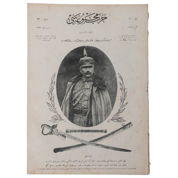 Fotoğrafın alt başlığında, "Muzaffer Osmanlı Ordusu´nun kıymetli hatıra-i şehametine ithafen Almanya İmparatoru Haşmetli İkinci Wilhelm Hazretleri tarafından Gazi Başkumandan akdes ve hilafe-i zişanlarımız hazretlerine buyurulan müşirlik asassıyla mersu´ kılıç" yazılıdır.