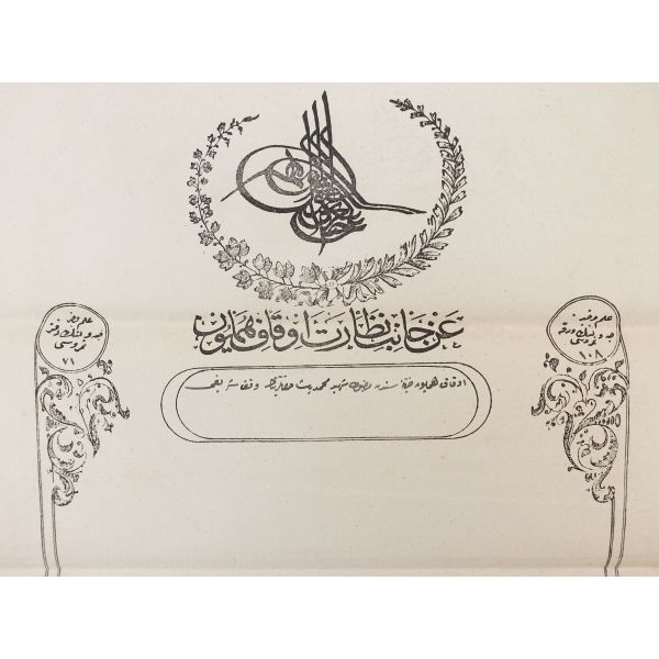 Larende´de (Karaman) bulunan Zeynelabidin Camii Şerifi´nin vaizi Ebubekir Efendi´nin beratının teceddüden (yeniden) verilmesinin konu alan el çekme Sultan İkinci Abdülhamid tuğralı berat...