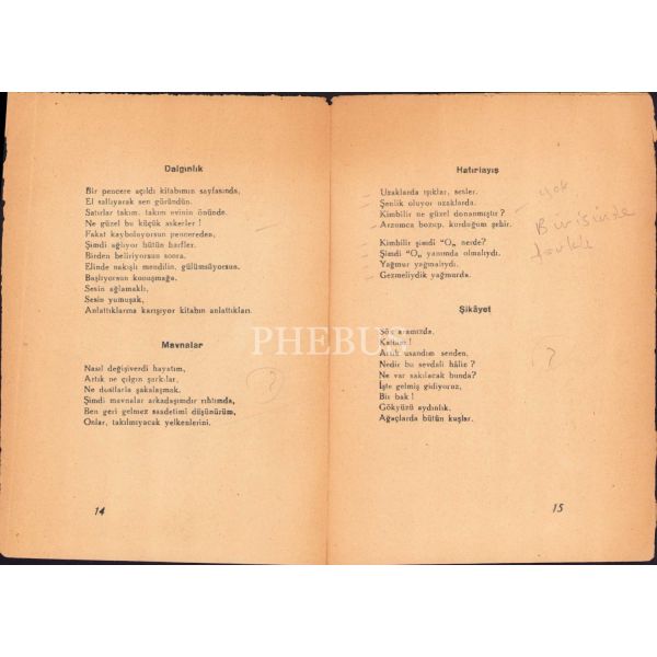 Nahit Ulvi Akgün´ün Mehmet Serpin´le birlikte yayımladığı ilk kitabı... "Yeni şiirin yeni münekkidi Muhterem Saffettin Pınar Bey´e sanat ve saygı bağları ile" ithafıyla 25.12 1945 tarihinde imzalanmıştır. * Kapakları kopuk ve ayrıca bant izleri taşıyor.