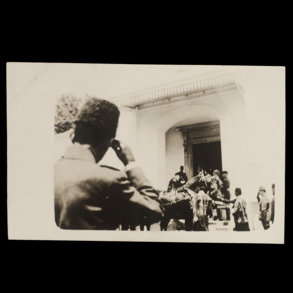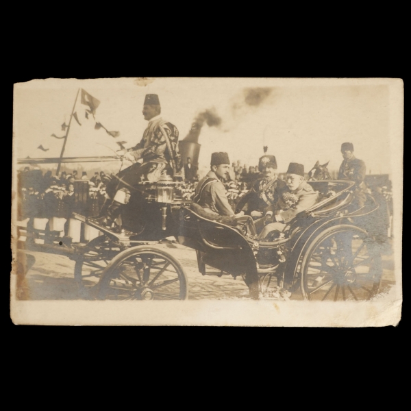 Kartona yapışıktır. Set üzerinde görülen sivil grup, Mabeyn-i Hümayun´dan aldıkları izinle Sultan İkinci Abdülhamid´in Cuma Selamlığı törenini izlemeye gelen yabancı turistlerdir.