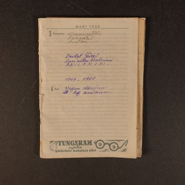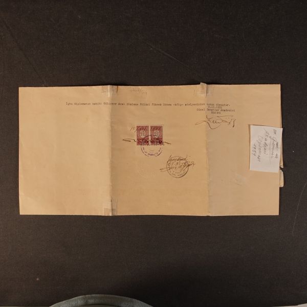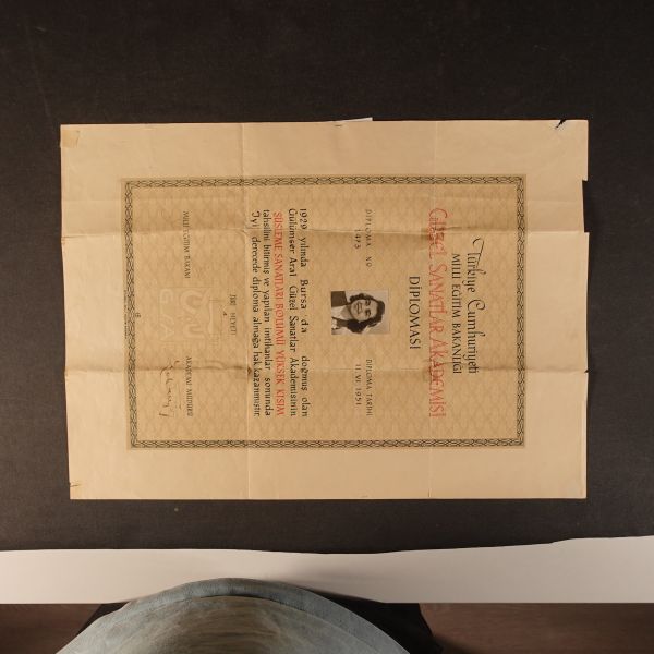 "1929 yılında Bursa´da doğmuş olan Gülümser Aral Güzel Sanatlar Akademisinin Süsleme Sanatları Bölümü Yüksek Kısım tahsilini bitirmiş ve yapılan imtihanlar sonunda İyi derecede diploma almağa hak kazanmıştır." (ön yüz) / "İşbu diplomanın sahibi Gülümser Aral Süsleme Bölümü Yüksek Dönem -Afiş- atelyesinden mezun olmuştur. 8.XI.1951 Güzel Sanatlar Akademisi Müdürü *Zeki Faik İzer* (ıslak imza)" *Arka yüzü çift Damga Pullu ve damgalı.