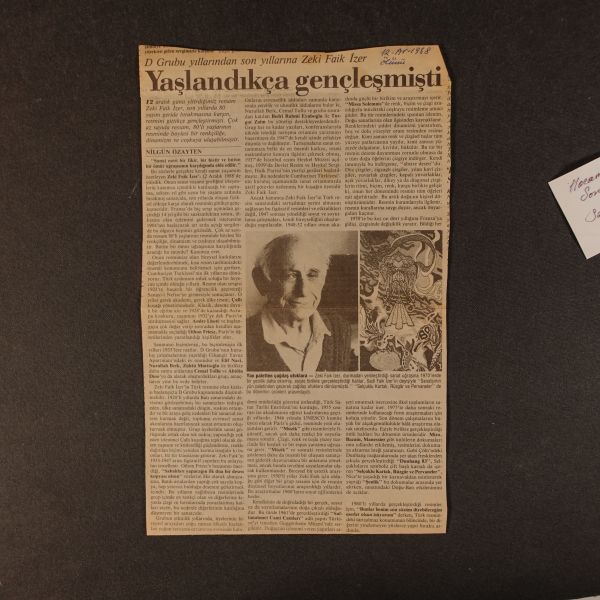 Defterden bir anekdot: "-Zeki beye telefon ederek müsabaka afişini görmek isteyip istemediğini, arzu ederse hemen mektebe getirebileceğimi söyledim. Pek memnun oldu. -Odasına girdiğimde Ressam Hikmet Onata -Dur! gitme Hikmet daha ziyafet bitmedi bunuda gör dedi- Afişi açarken çok heyecanlıydım. Bu iş erbabının cevabı acaba ne olacak idi? Zeki bey çok memnun Hikmet beye dönerek güldü -bana -İftihar ediyorum, cidden çok güzel- tebrik ederim Gülümser dedi. Hikmet beyde ayni samimi ve açık bir ifade ile benim elimi sıkarak ayrıldı...Hakikaten mes´uttum, bu sözler beni memnun etmişdi. İçimden ağar bir yükün gitdiğini hissediyordum."