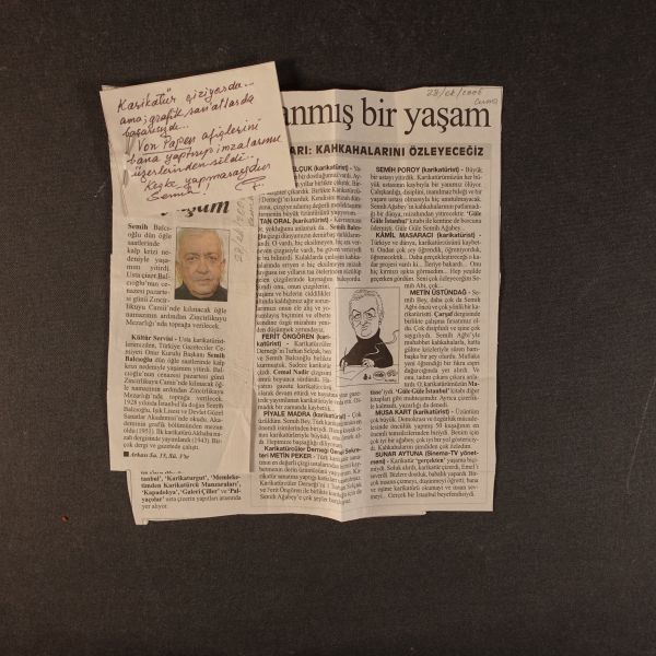 Gülümser Aral tarafından kaleme alınan not: "Karikatür çiziyordu... ama; grafik san´atlarda başarısızdı.. Von Papen afişlerini bana yaptırıp imzalarımı üzerlerinden sildi.. Keşke yapmasaydın Semih!"