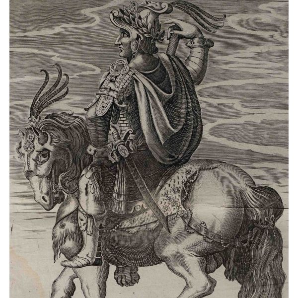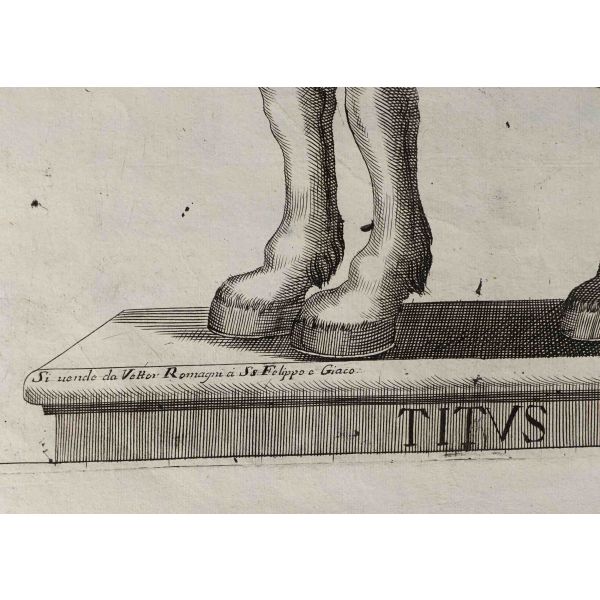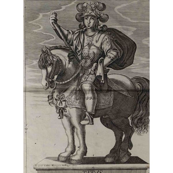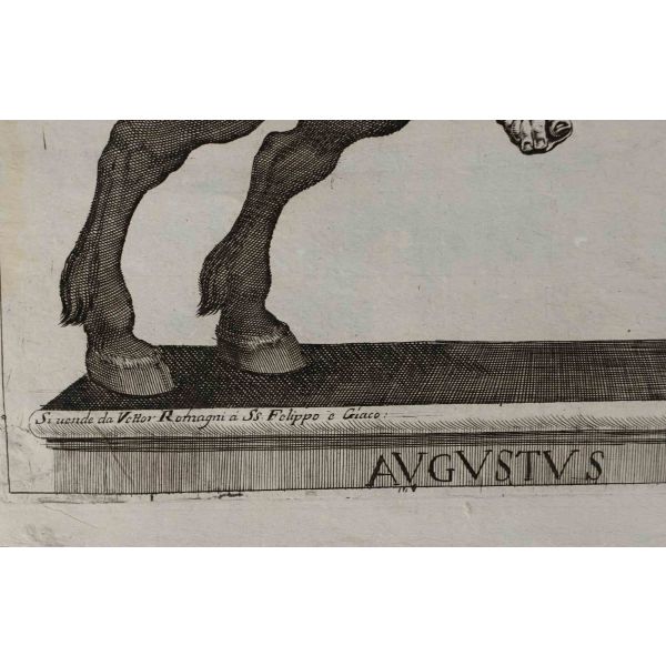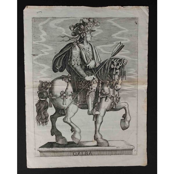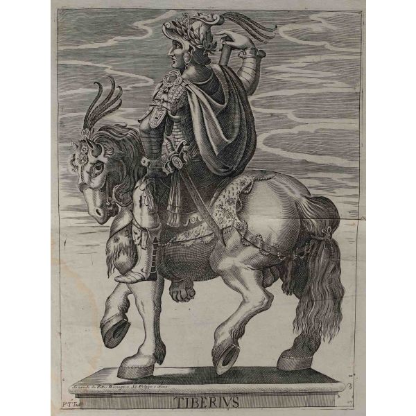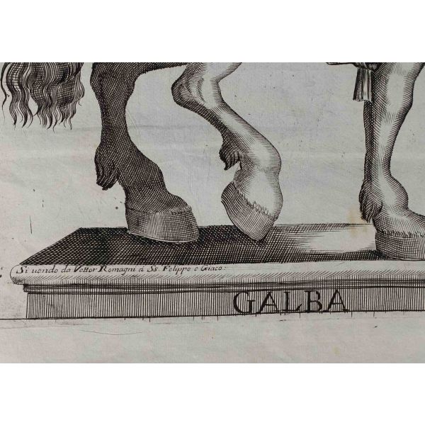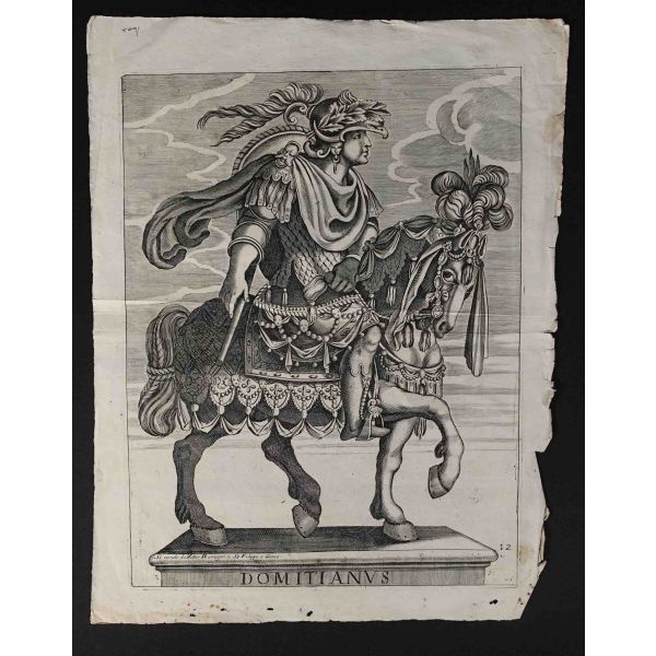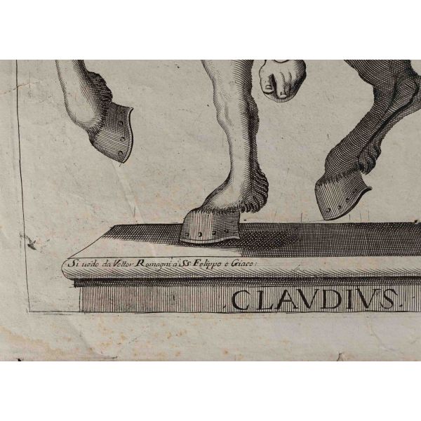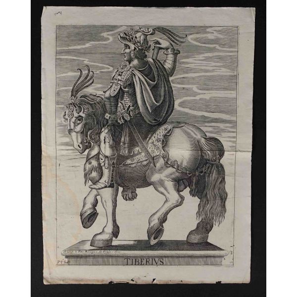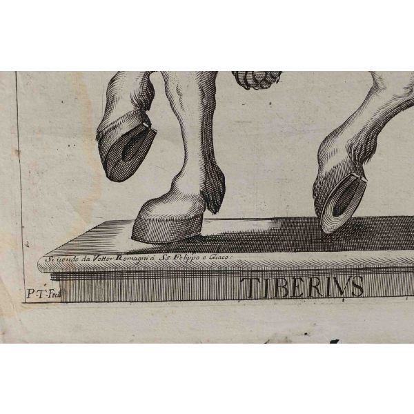 Roma İmparotorluğu - The Twelve Caesars serisinden 1754 tarihli gravür. "Si vende da Vettor Romagni a Ss. Felippo e Giaco. - P.T. Fecit" Bir kitabın içinden çıkma değil, müstakil olarak basılıp satılmış bakır baskı gravür. Sol kenarında 3 cm uzunluğunda bir yırtık mevcuttur.