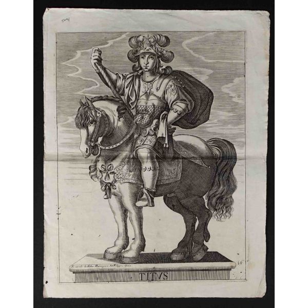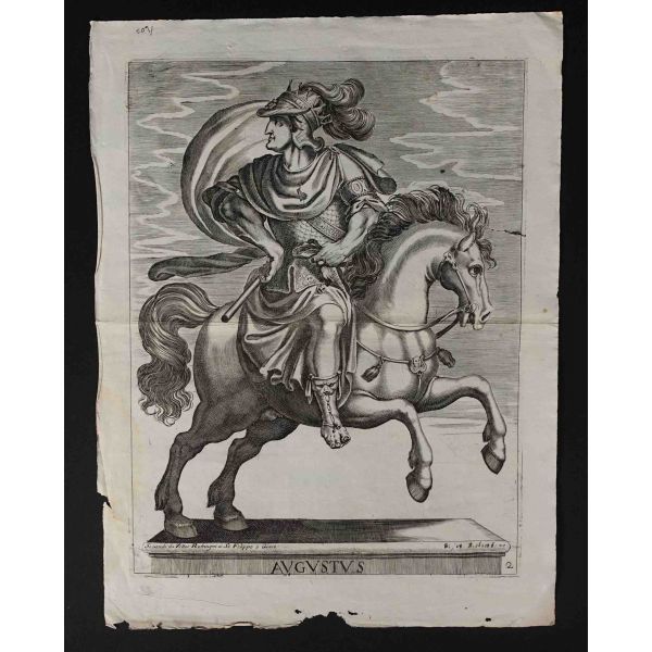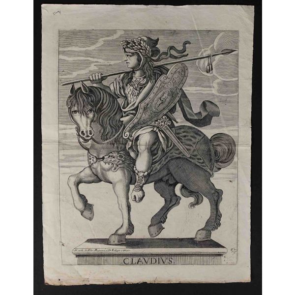 Roma İmparotorluğu - The Twelve Caesars serisinden 1754 tarihli gravür. "Si vende da Vettor Romagni a Ss. Felippo e Giaco. - P.T. Fecit" Bir kitabın içinden çıkma değil, müstakil olarak basılıp satılmış bakır baskı gravür. Sol kenarında 4 cm uzunluğunda bir yırtık mevcuttur.