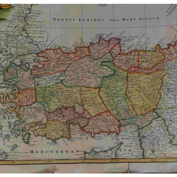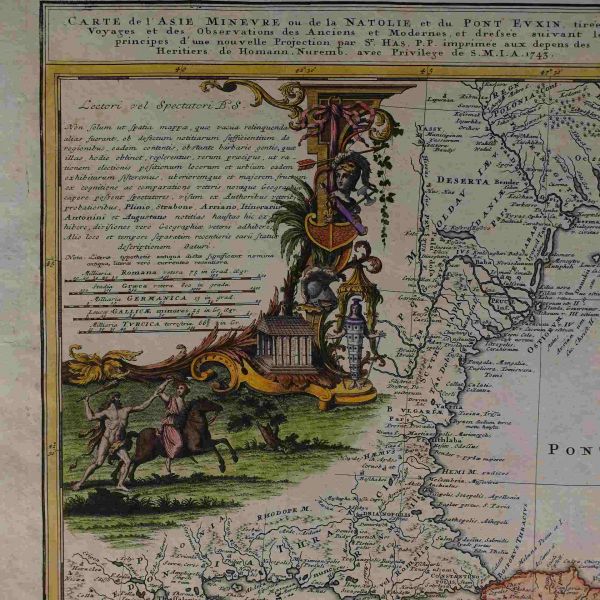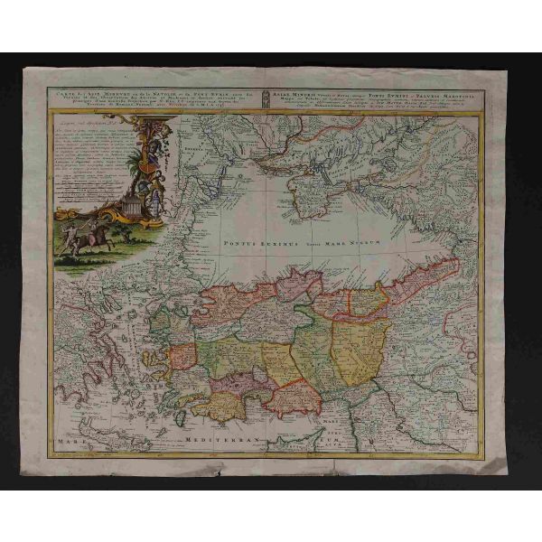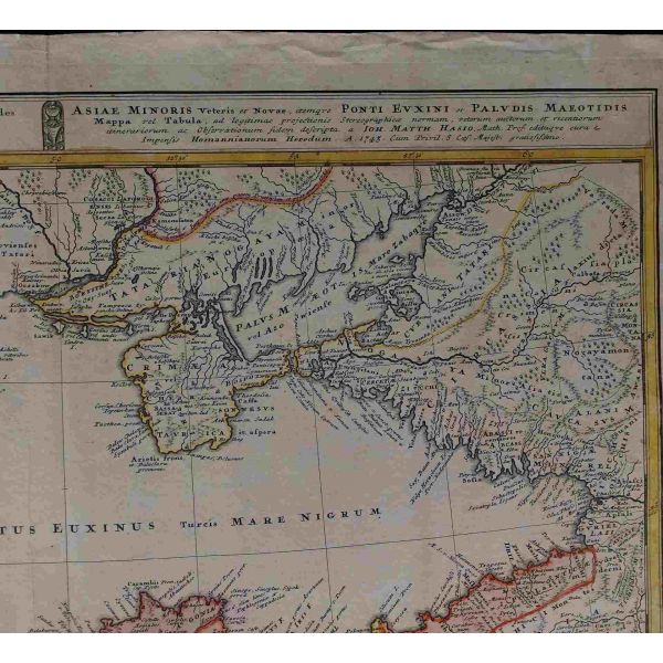 Yayınladığı haritalara konu edinilen bölgenin etnik tiplerini ve mimarisini yansıtan alegorik sahneler eklemesiyle tanınan Haritalarında konu edindiği bölgenin etnik tiplerini ve mimarisini yansıtan alegorik sahneler eklemesiyle tanınan Johan Matthias Hase´ın (1684 - 1742) yayınladığı Küçük Asya ve Karadeniz haritası...