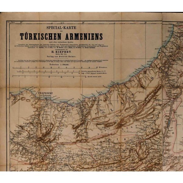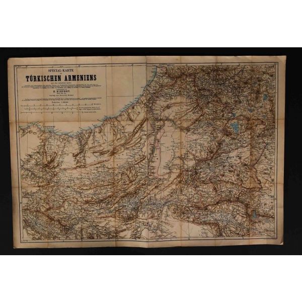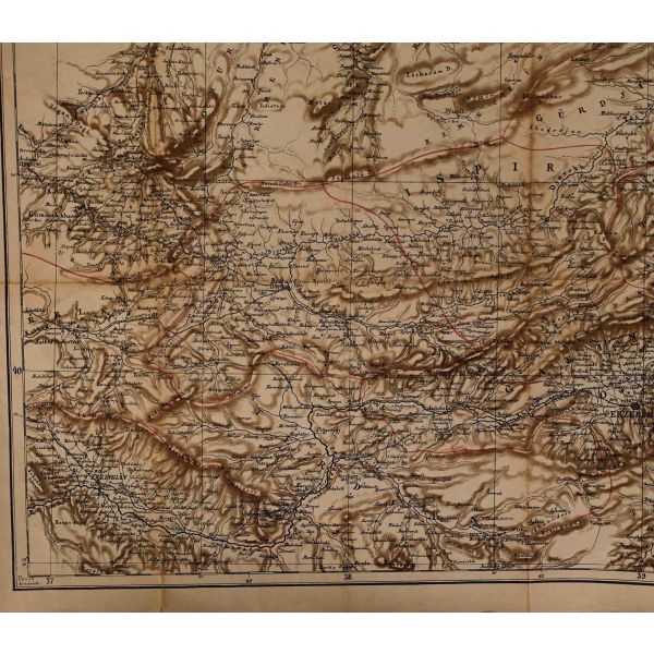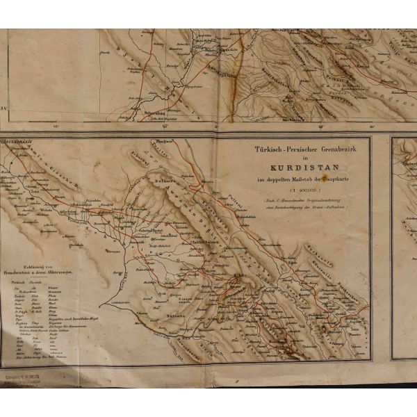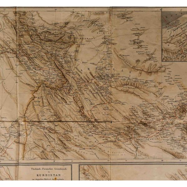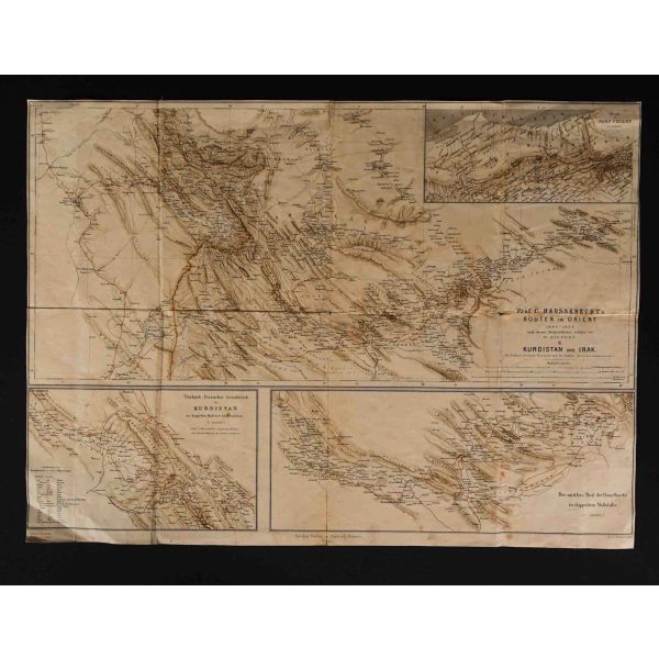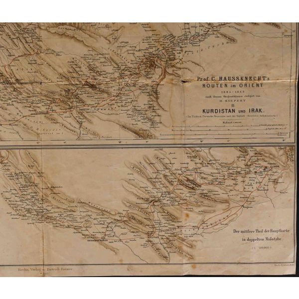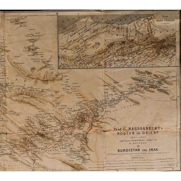 Alman botanist Carl Haussknecht´in 1865 ve 1869 yıllarında örnek toplamak amacıyla gerçekleştirdiği Anadolu gezilerinde aldığı eskizlerin Heinrich Kiepert tarafından temize çekilmesiyle meydana gelen Kürdistan ve Irak haritası... "Librairie S. H. Weiss (E. Heydrich Successour) Constantinople" damgalı.