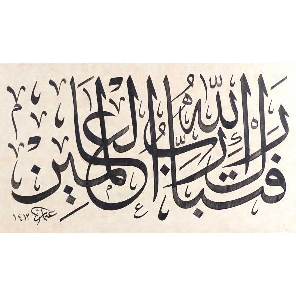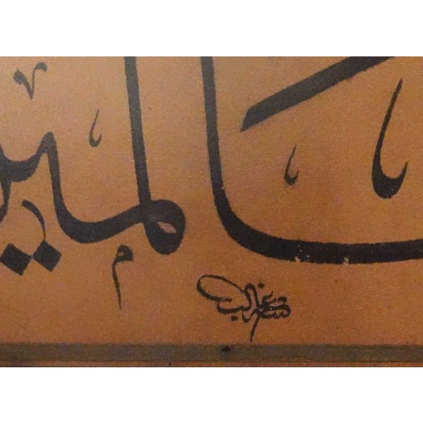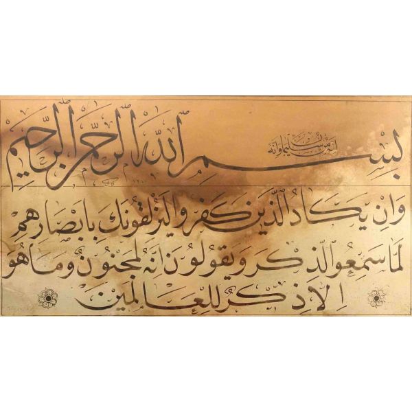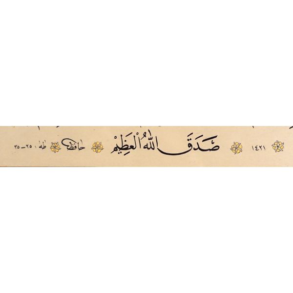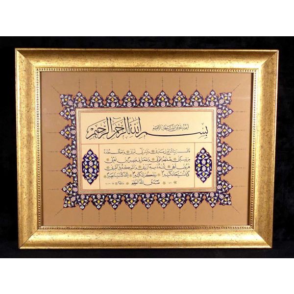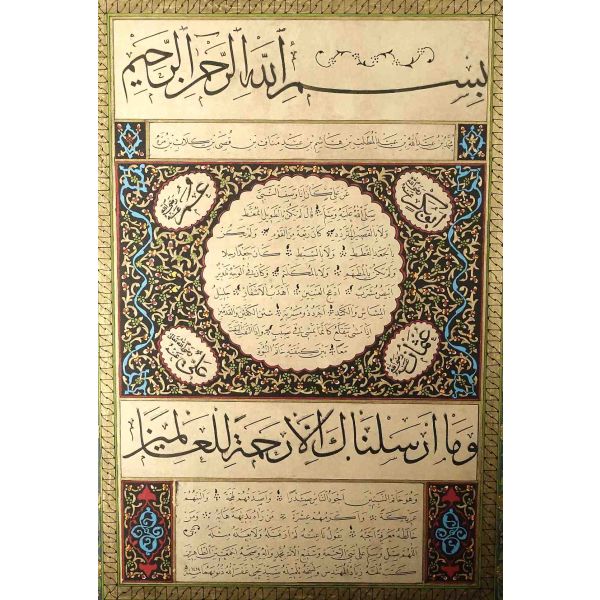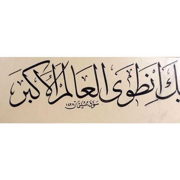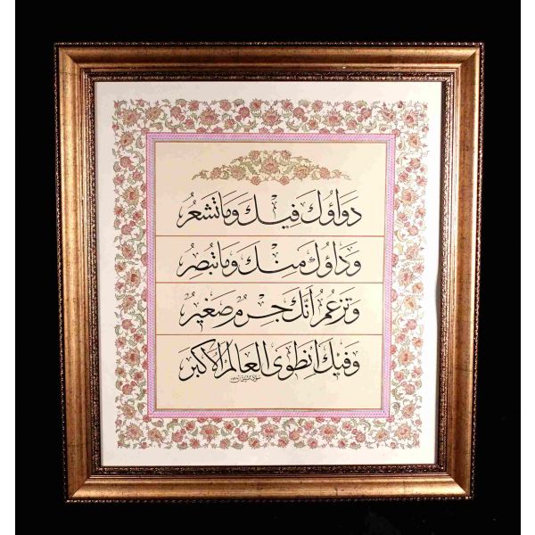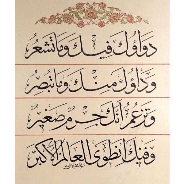 Okunuşu: "Devâüke fîke ve mâ teş´uru; Ve dâüke minke ve mâ tübsıru; Ve tez´umu enneke cirmün sagîrun; Ve fîke´ntava´l-âleme´l-ekber [İlacın sendedir, farkında olmazsın; Hastalığın sendendir; görmezsin; Küçük bir nokta olduğunu iddia edersin; Halbuki sende dürülmüştür büyük bir âlem]"
