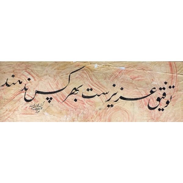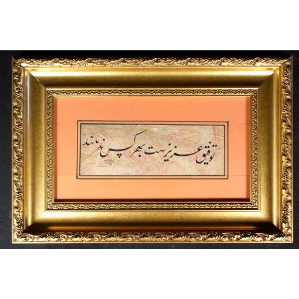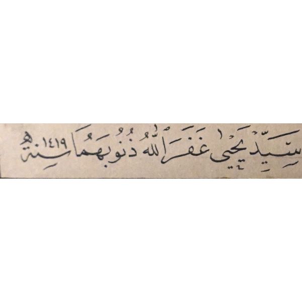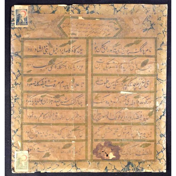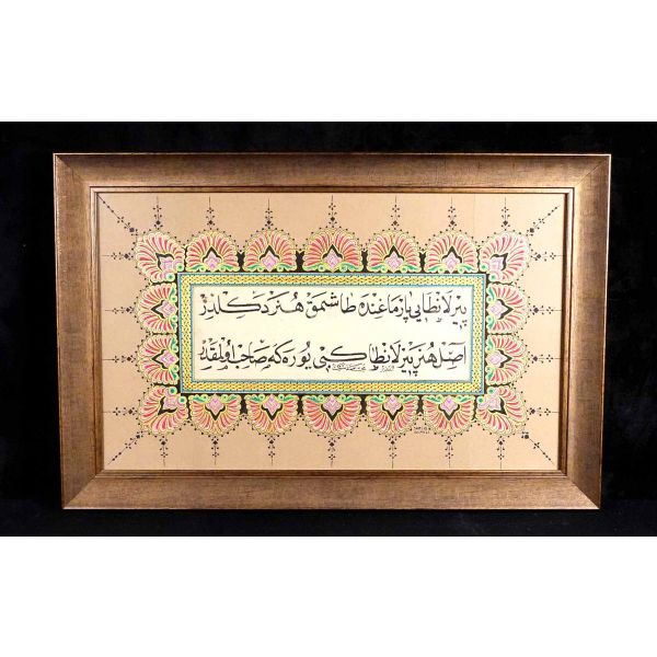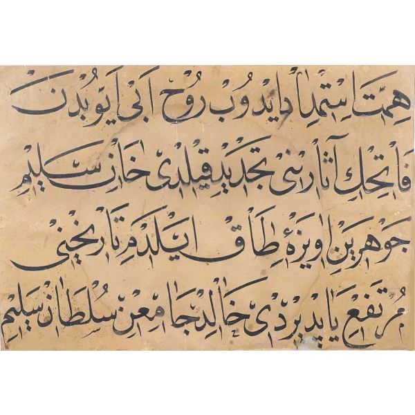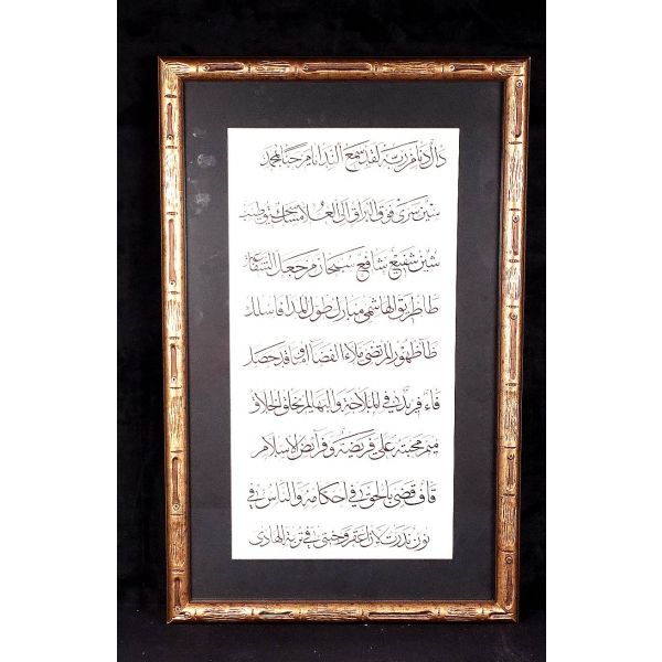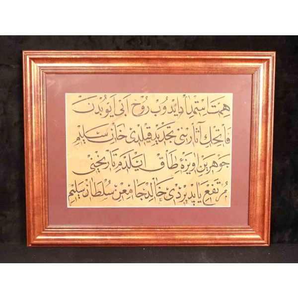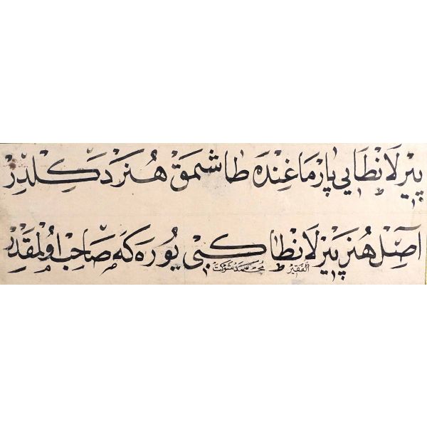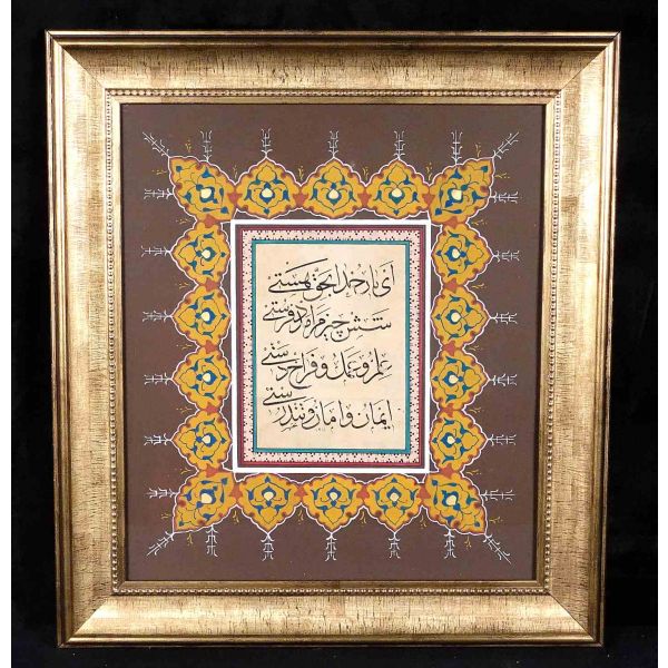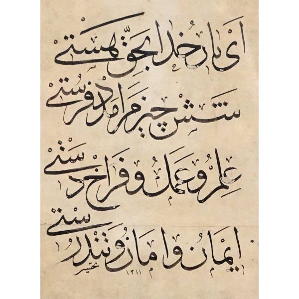 Okunuşu: "Ey Bâr-ı Hudâ be-hak-ı hestî; Şeş çîz merâ meded ferestî; İlm ü amel ü ferâh-destî; Îmân ü emân ü ten-dürüstî [Ey Cenâb-ı Allah, varlığn hakkı için; Şu altı şeyi yardımıma gönder; İlim, amel ve el açıklığı; İman, güvenlik ve beden sağlığı]" (Ebu Saîd Ebu´l-Hayr)