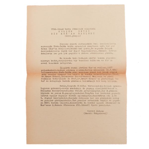 Kitap, Süheyl Ünver´in öncülük ettiği 50 Sanatsever Serisi´nde 17. sırada 1960 yılında basılmıştır. Bu lottaki mektup, ilgili kitaptaki rahleye dair müellifin daktilo ile yazdığı bir mektuptur. Kitaptaki metinden farklı bilgiler bulunmaktadır.