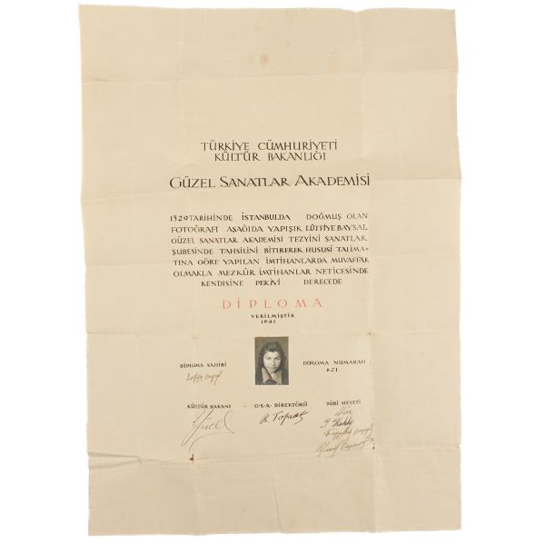 Lütfiye Baysal´ın 1941 yılında Güzel Sanatlar Akademisi Tezyini Sanatlar şubesi diploması 56x40 cm, Çok sayıda çizim ve süsleme bulunan motif defteri, yaklaşık 20 adet elle yapılmış minyatür-motif çalışmaları, 5 adet ebru, 1 adet kendisine gönderilmiş mektup zarfı, 1 adet şahsi Osmanlıca evrakı, 1 adet Osmanlıca mektup, 1 adet muhakkak besmele kalıbı.