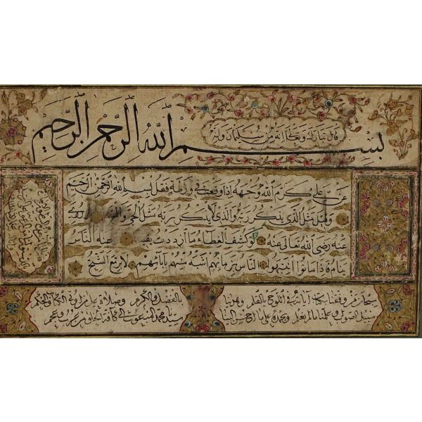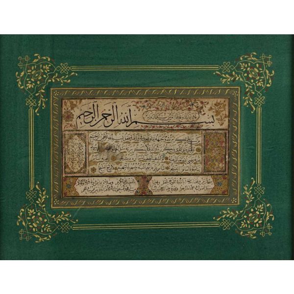 Yazının tam ortasında kalınca bir "Çelebi " imzası mevcuttur. Levha üzerinde celi divani yazı ile istiflenmiş dört ayet-i kerime mevcuttur. Sol üstte, "Biz seni ancak alemlere rahmet olarak gönderdik." manasına gelen Enbiya suresi 107. ayet-i kerime "Ve ma erselnâke illâ rahmeten li'l-âlemîn" görülmektedir.