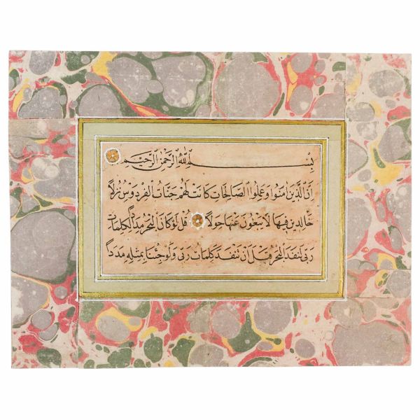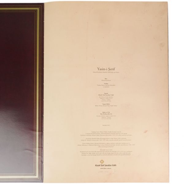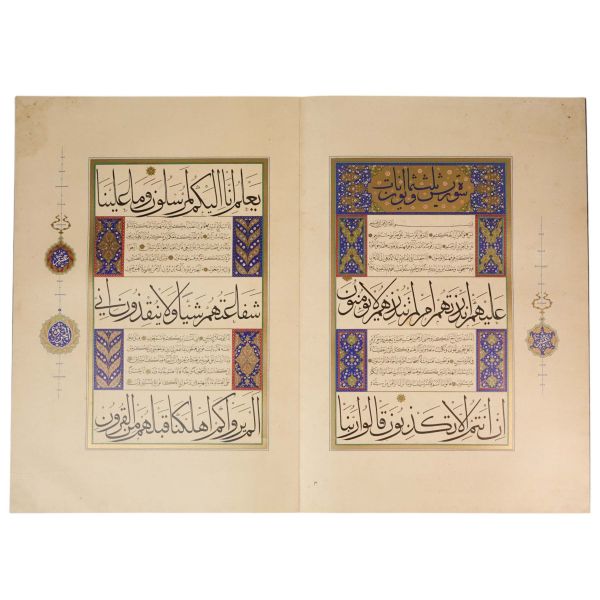 Orijinal ahşap kutusunda. Kanuni Sultan Süleyman´ın emirleriyle hattat Ahmet Karahisarî tarafından yazılmaya başlanan bu Kur´an-ı Kerîm, 16.. yüzyılın en büyük şaheserlerinden biridir. 220 yaprağı 1545-1555 yılları arasında Ahmet Karahisarî, 80 yaprağı 1584-1587 yılları arasında manevi evladı Hattat Hasan Çelebi tarafından, süslemeleri ve cildi ise 1584-1596 yılları arasında nakkaşlar tarafından tamamlanmıştır. Üç padişah döneminde (Kanuni-III. Murat-III: Mehmed) yazılan Osmanlı dünyasının bu en güzel ve en büyük Kur´an-ı Kerim´inde, nakkaşlar, müzehhipler, ciltçiler tüm ustalık ve hünerlerini ortaya koyarak bu şaheseri meydana getirmiştir.