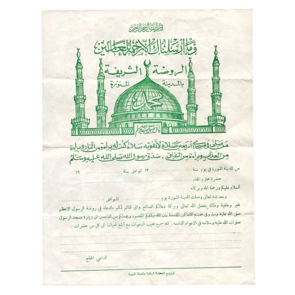 “Kim benim şu mescidimde, bir tek vakti geçirmeksizin kırk vakit namaz kılarsa, kendisi için cehennemden berat ve azaptan kurtuluş yazılır. O kişi nifaktan da uzak olur” hadis-i şerifine binaen, Medine-i Münevvere´de ilgili görevliler tarafından gözlemlenip tamamlandığında imzalanması için hazırlanan broşür türü belge. Belgede şahit olan yetkili kişiler, namaz kılan hacı için imza bölümleri ve tarih kısmı yer almaktadır.