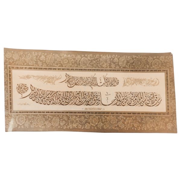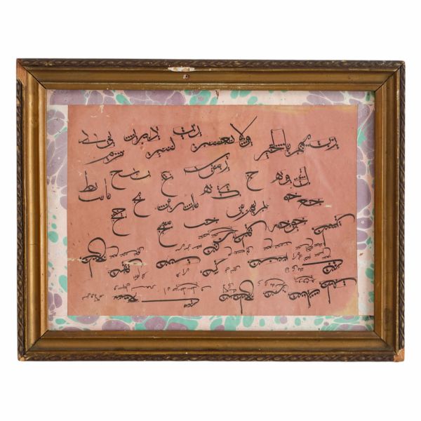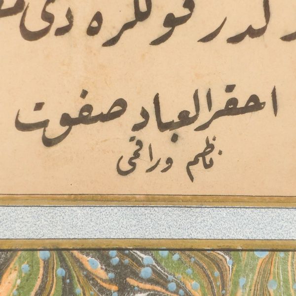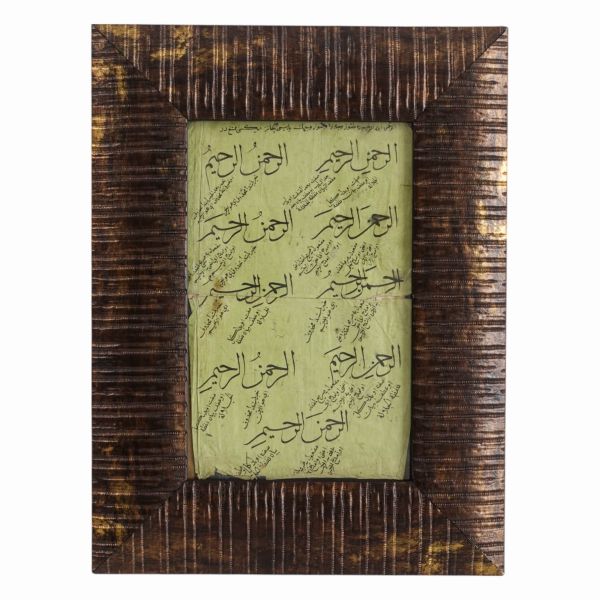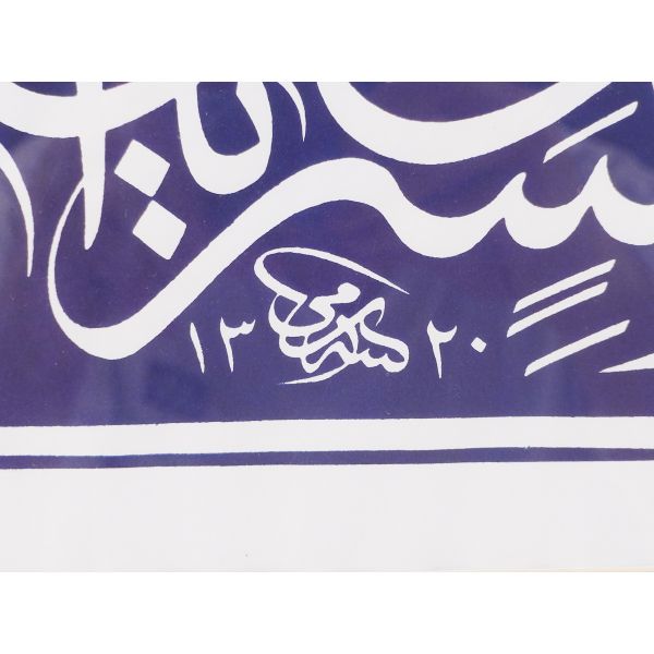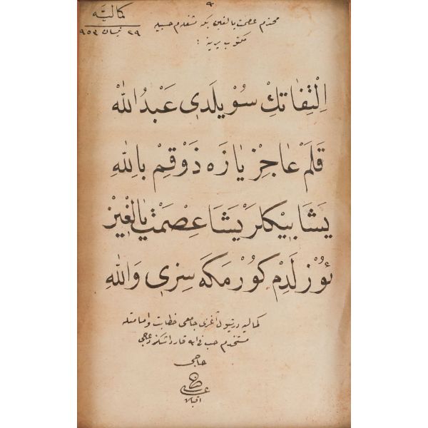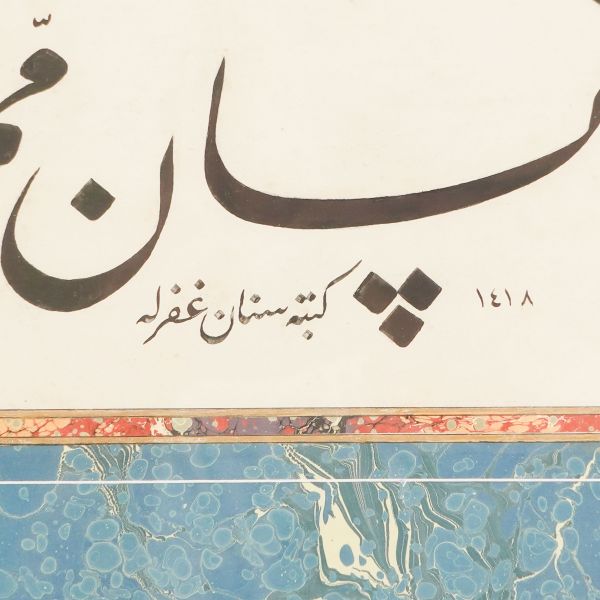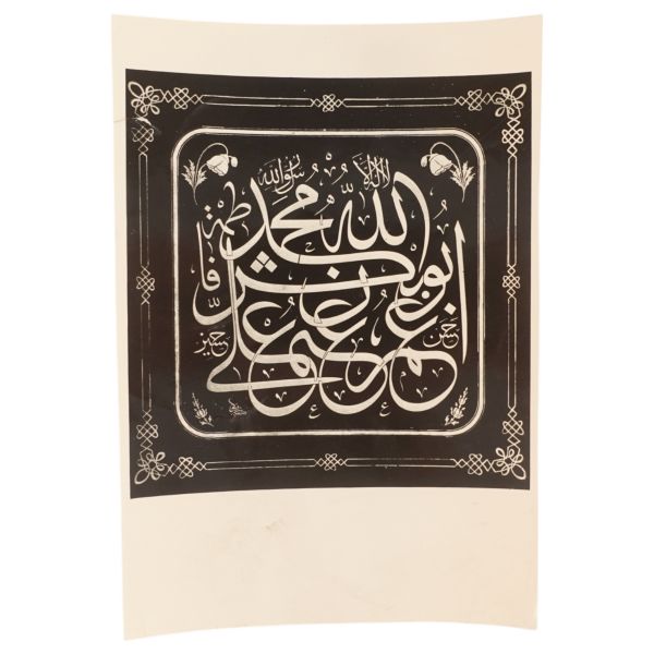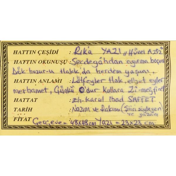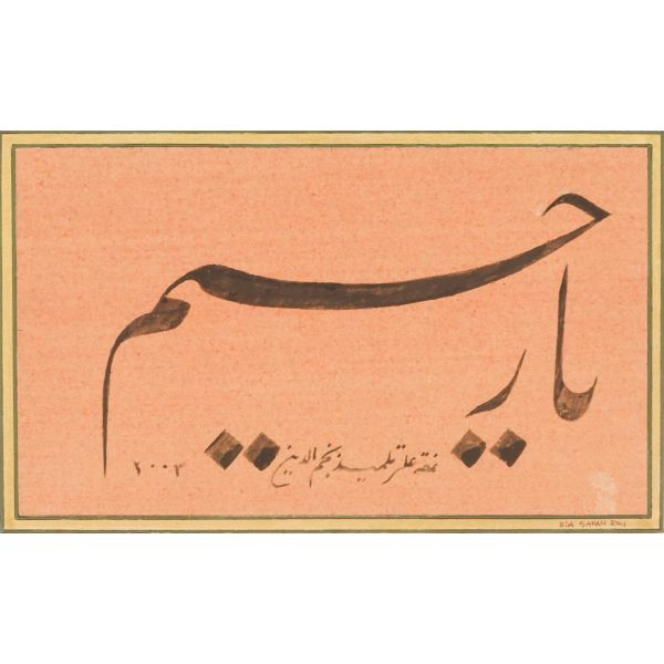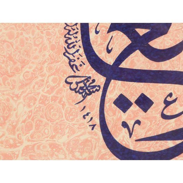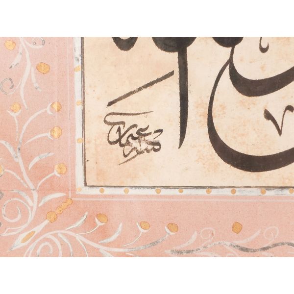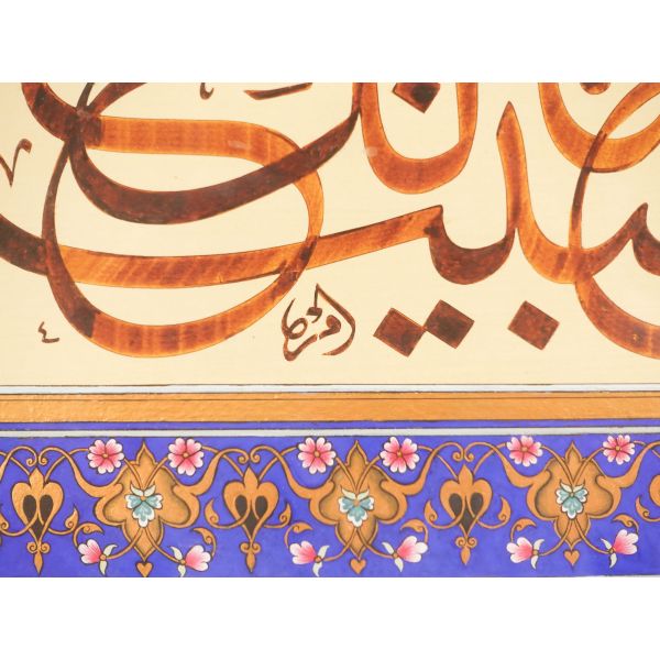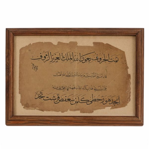 Sol tarafına 99 (1299) tarihi düşülmüştür. Sülüs kısımda hurufat meşkinin bittiği ve ebced harfleri yazılıdır. Nesih kısımda Hz. Ali'nin "Allah'ın aslanı" olduğunu söyleyen hadis-i şerif vardır.