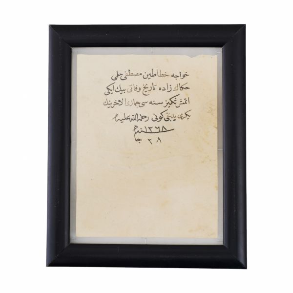 "Hâce-i hattâtîn Mustafa Hilmi Hakkâkzâde târîh-i vefâtı bin iki [yüz] a[l]tmış sekiz senesi Cemaziyelâhirinin yirmi yedinci günü, rahmetullâhi aleyh. Sene 1268 28 CA."