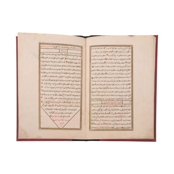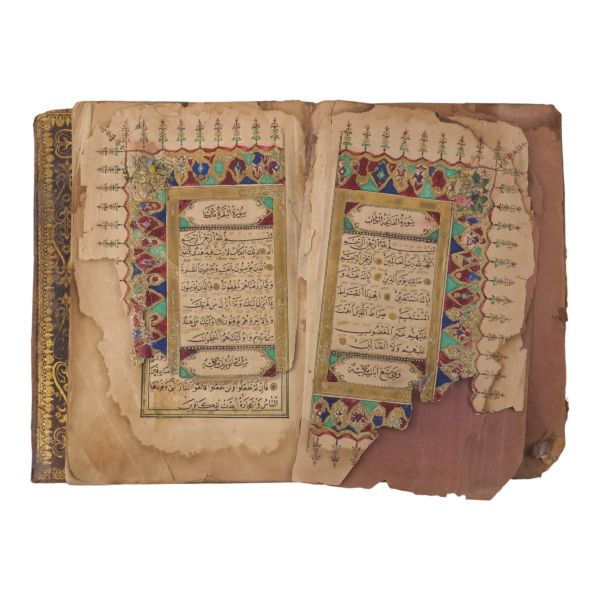 Mıklebli ve yaldız işlemeli deri dönem cildinde Osmanlı dönemi renkli taş baskı Kur'ân-ı Kerim.