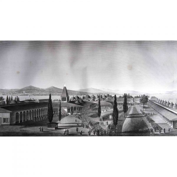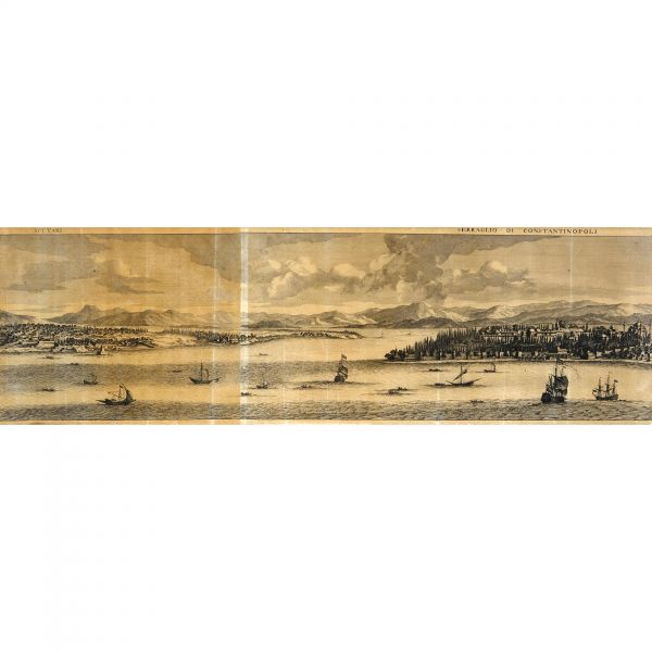 1678 yılında çıkıp, 1684 yılında tamamladığı Osmanlı İmparatorluğu ve çevresini kapsayan 6 yıllık seyahatini, son derece etkileyici gravürlerle süsleyen Cornelis de Bruyn´un gözünden Üsküdar´dan Topkapı Sarayı´na kadar uzayan panoramik bir Boğaz manzarası... "Scutari - Serraglio di Constantinopoli."