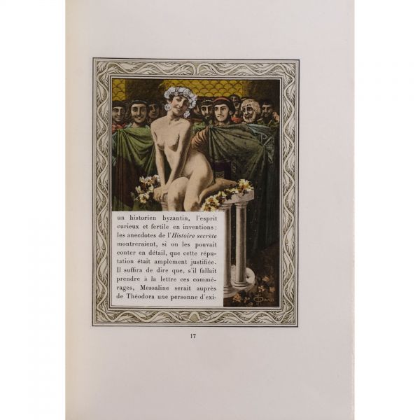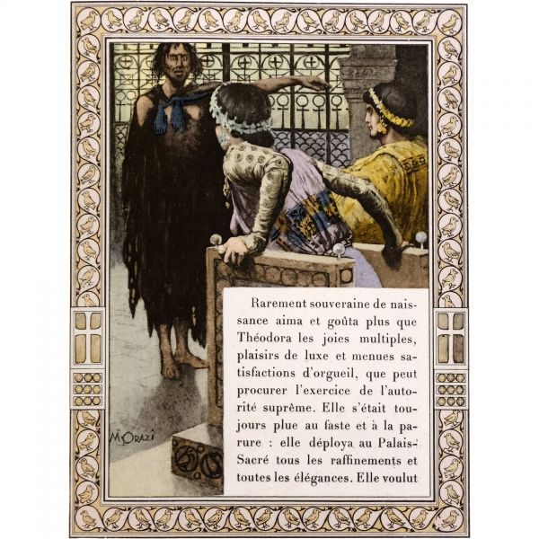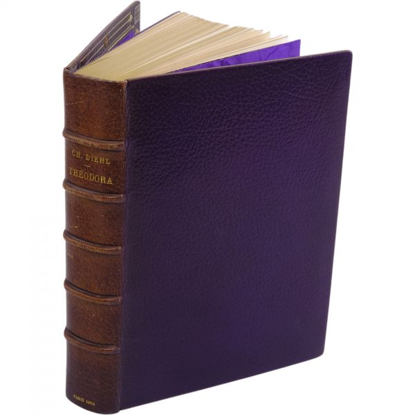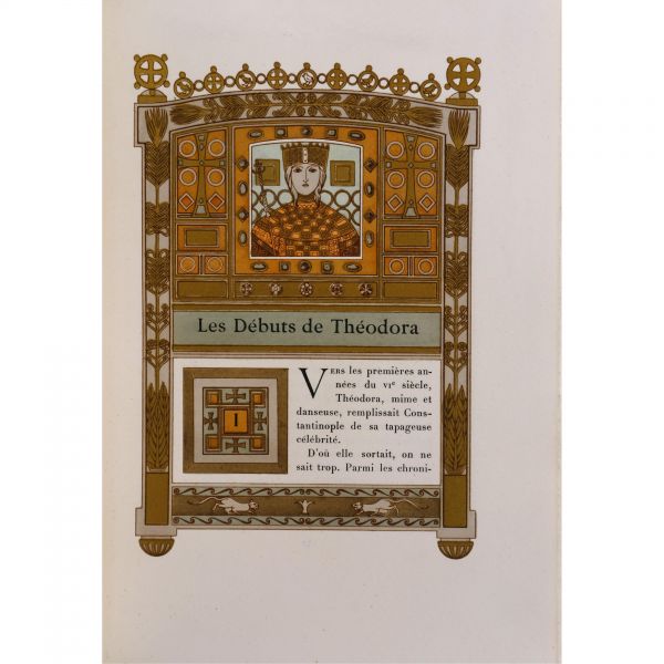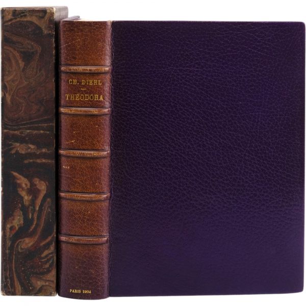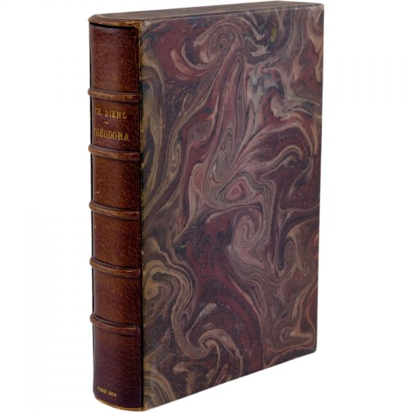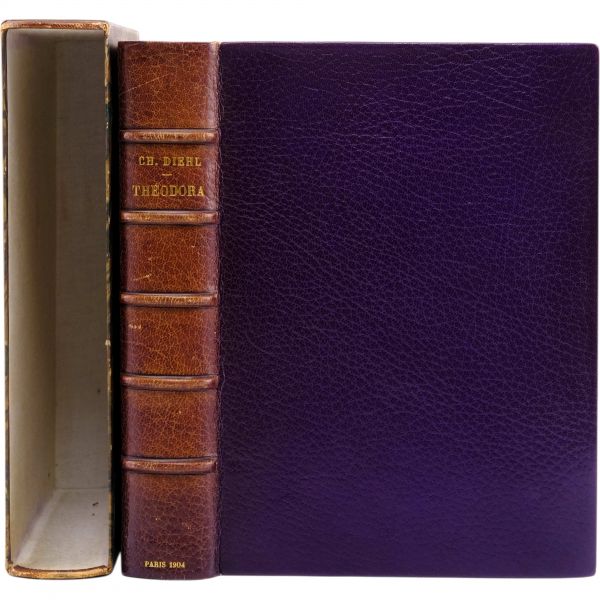 Bizans sanatı ve tarihi üzerine çok sayıda çalışmaya imza atan Fransız tarihçi ve Bizantolog Charles Diehl´ın (1859-1944), Bizans İmparatoru I. Justinianus´un, Bizans tarihinin en ilginç figürlerinden biri olan eşi Theodora üzerine kaleme aldığı eserinin, sınırlı sayıda basılmış özel nüshası... Tarihi, sanatsal ve koleksiyon değerleri açısından önemli bir edisyon olan kitapta, Manuel Orazi imzalı çok sayıda gözalıcı renkli resim yer almaktadır. Blanchet Kardeşler ve Kleber tarafından el yapımı, yüksek kaliteli velim kâğıda basılmış ve 41´den 300´e kadar numaralandırılmış 260 kopyanın 268 numaralı nüshası... Sırtı panelli ve altın yaldız başlıklı, iç kapakları altın yaldız tezyinatlı ve mor kadife kaplı, giriş ve bitiş sayfaları ebru desenli deri cildinde. Ebru desenli özel kutusuyla birlikte.