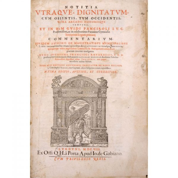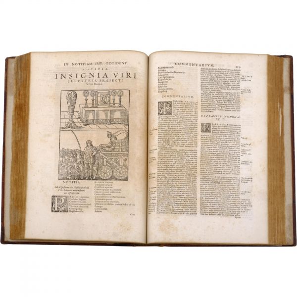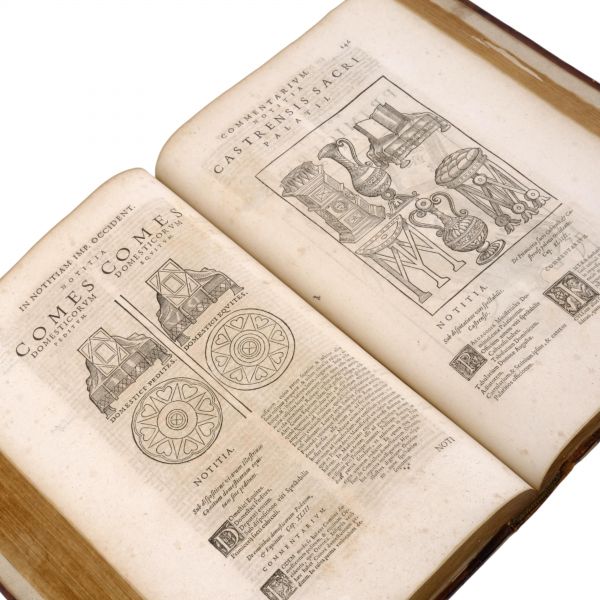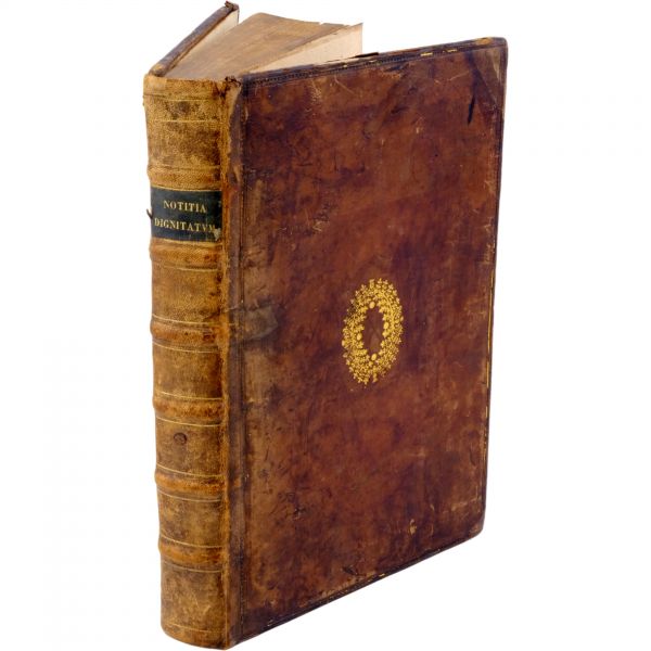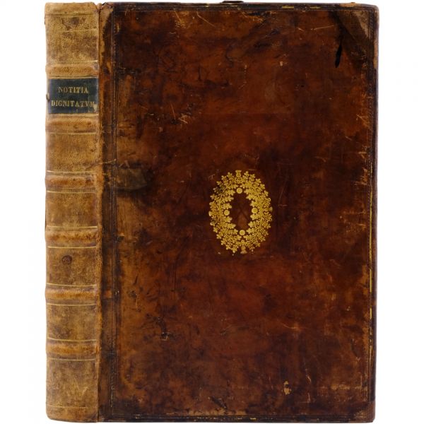 Roma imparatorluğu´nun idari yapısı hakkında emsalsiz bir veri kaynağı olan resmî imparatorluk dokümanı "Notitia dignitatum"un 1608 tarihli, çok sayıda tablo, şekil ve illüstrasyon içeren nadide bir baskısı... Doğu ve Batı Roma imparatorluklarının askeri ve idari yapılanmalarının titizce mercek altına alındığı kitapta ayrıca Roma´nın on dört bölgesi ve yapılarına (kamu ve özel) dair bir ek mevcuttur. Sırtı panelli, ön ve arka kapağı süslemeli, tümüyle deri koleksiyoner cildinde...