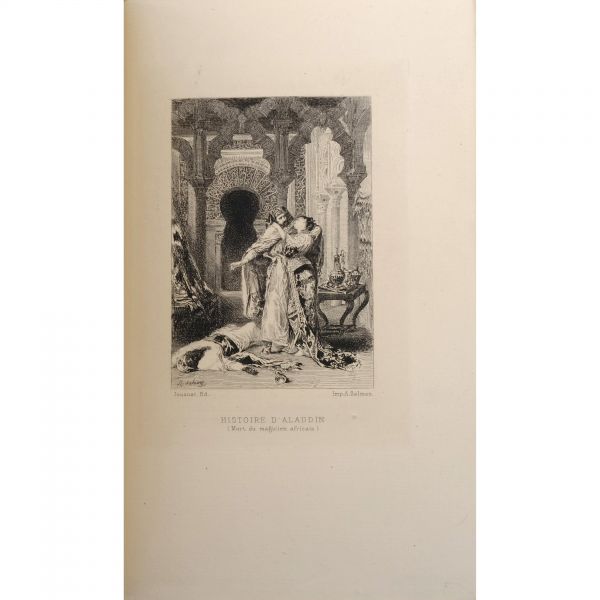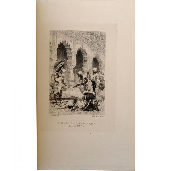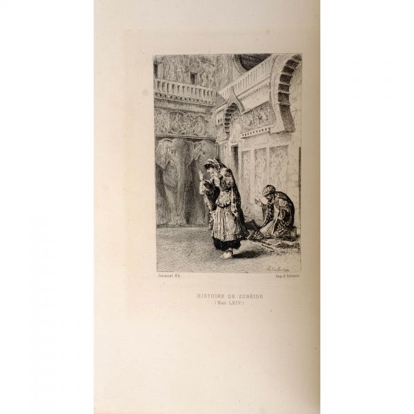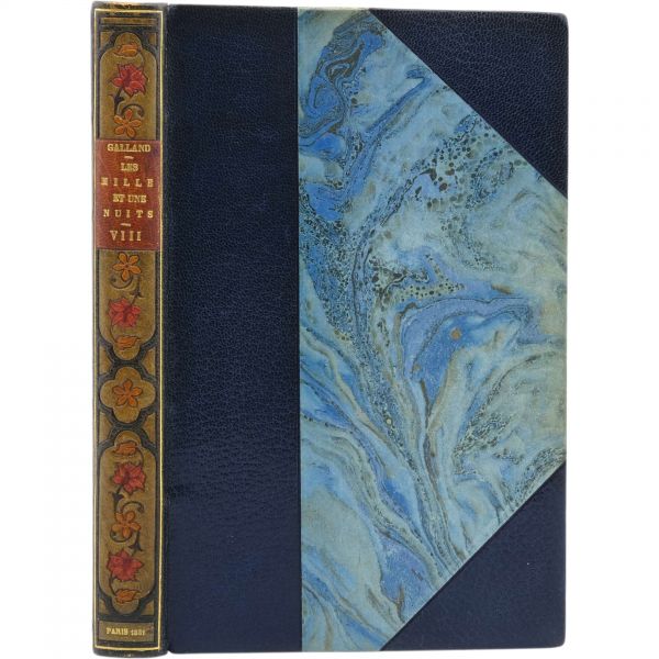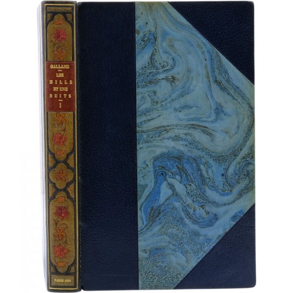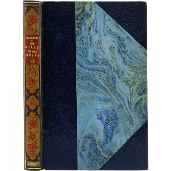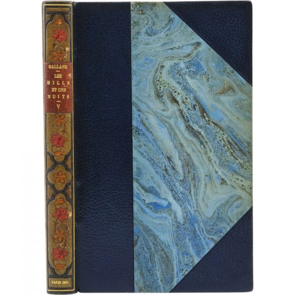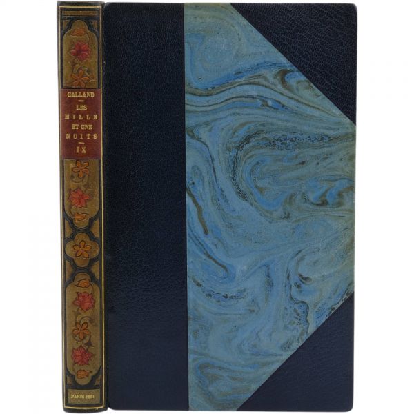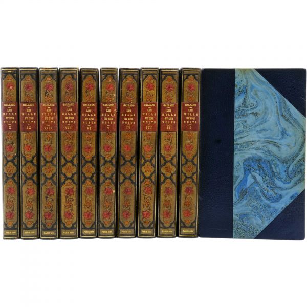 Fransız şarkiyatçı ve çevirmen Antoine Galland’ın ünlü Binbir Gece Masalları çevirisinin 19. yüzyılda yapılmış, sınırlı basım özel edisyonu. 51´den 220´ye kadarki nüshaları özel Hollanda kâğıdına basılmış 220 kopyanın 146 numaralı nüshası... Ad. Lalauze´nin 21 gravürü eşliğinde. Sırtı altın yaldız başlıklı ve gofre floral desenlerle bezeli, iç ve dış kapakları ebru süslemeli deri dönem ciltlerinde. Sayfa üstleri altın yaldızlıdır.