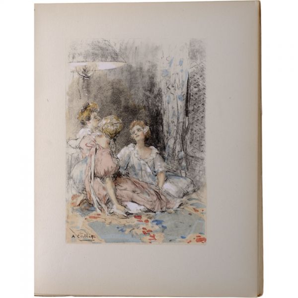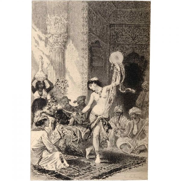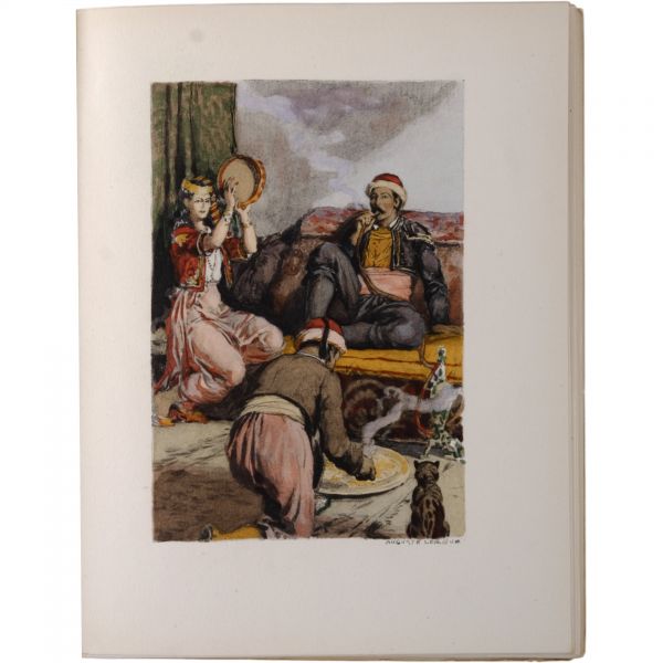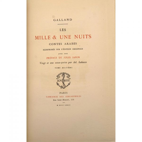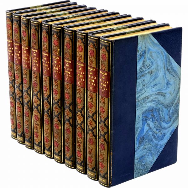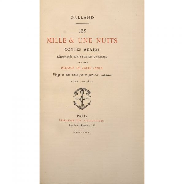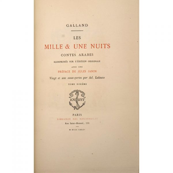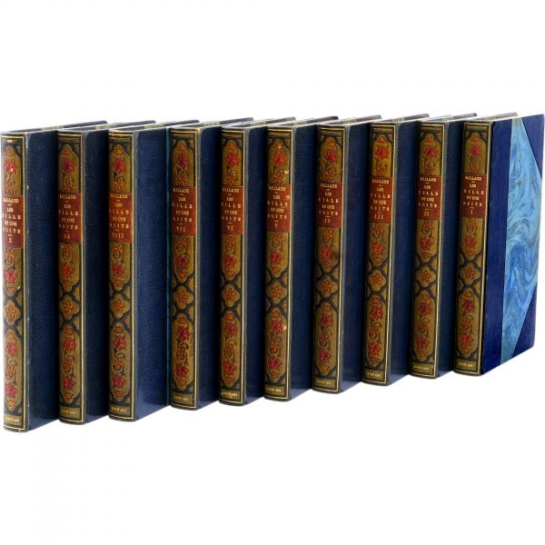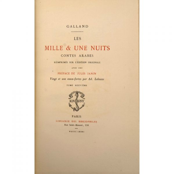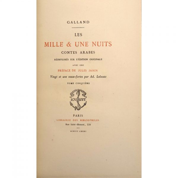 Fransız şarkiyatçı ve çevirmen Antoine Galland’ın ünlü Binbir Gece Masalları çevirisinin 19. yüzyılda yapılmış, sınırlı basım özel edisyonu. 51´den 220´ye kadarki nüshaları özel Hollanda kâğıdına basılmış 220 kopyanın 146 numaralı nüshası... Ad. Lalauze´nin 21 gravürü eşliğinde. Sırtı altın yaldız başlıklı ve gofre floral desenlerle bezeli, iç ve dış kapakları ebru süslemeli deri dönem ciltlerinde. Sayfa üstleri altın yaldızlıdır.