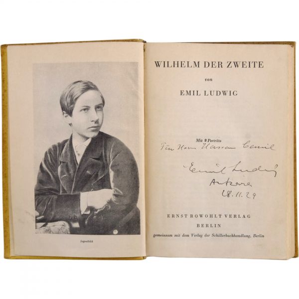 Alman biyografi yazarı Emil Ludwig´in, 28 Kasım 1929 tarihinde Ankara´da, Hasan Cemil Çambel'e ithafen imzaladığı, son Alman İmparatoru (Kayzer) ve Prusya Kralı II. Wilhelm´in hayatını mercek altına aldığı kitabı... *Kitaptaki bazı satırların altı kurşun kalemle çizilmiştir.