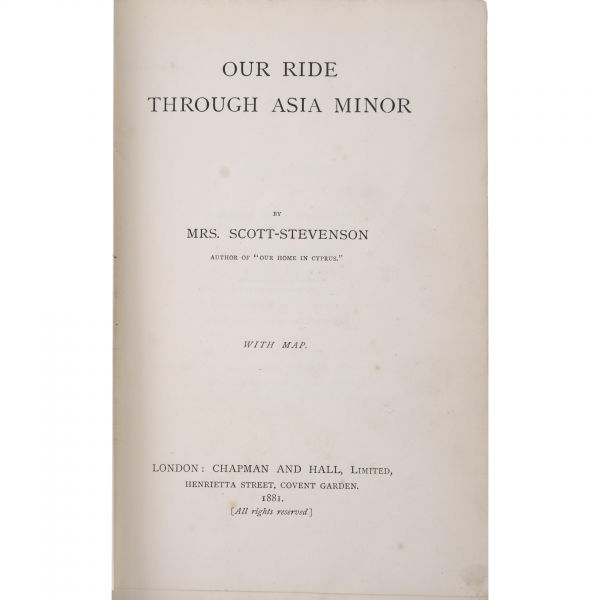 19. yüzyıl sonunda yaşamış Britanyalı bir kadın seyahat yazarı olan Scott-Stevenson'ın, eşiyle birlikte çıktığı ve at sırtında gerçekleştirdiği Anadolu gezisi izlenimleri... Ön iç kapakta C. E. Rusbridge adına bir ex libris mevcuttur. Sırtı altın yaldız başlıklı, ön kapağı dekorlu bez dönem cildinde. Kitap içinde gezilen güzergahı gösteren bir harita mevcuttur.
