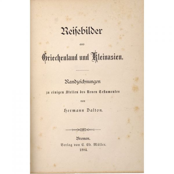 Alman teolog ve papaz Hermann Dalton’un, 19. yüzyılda Yunanistan ve Anadolu'ya yaptığı yolculuğu anlattığı; antik şehirler, İncil’de adı geçen bölgeler ve kültürel-toplumsal gözlemler üzerine notlar içeren; dini ve teolojik bir perspektifle kaleme alınmış bir seyahatname. Sırtı ve ön kapağı altın yaldız dekor ve başlıklı dönem cildinde.