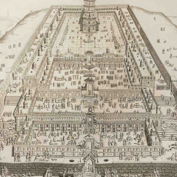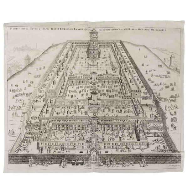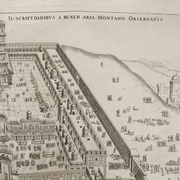 İspanyol asıllı oryantalist Benedictus Arias Montanus´un 1572 yılında derlediği "Terrae Israel omnis ante Canaan..." Kitabından çok nadir bir gravür... Orjinali Christophorus Plantinus tarafından Antwerp´te basılmıştır (1590). Bakır baskı. Cilt 6, sayfa 618. Klişe boyutları: 47 x 39 cm, kâğıt boyutları: 58 x 48 cm... Latince yazılı... Monis Domini Totiusq Sacri Templi Exemplum Ex Antiquis Decriptionibvs a Bened Aria Montani Obervatis. Orta kat yeri tamirlidir.