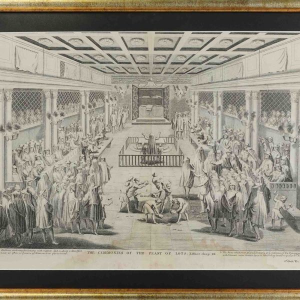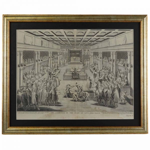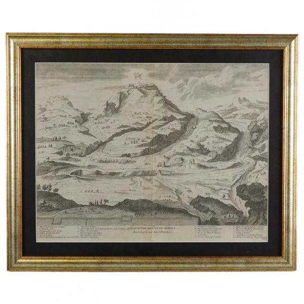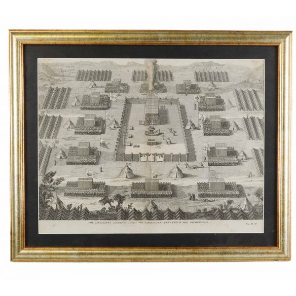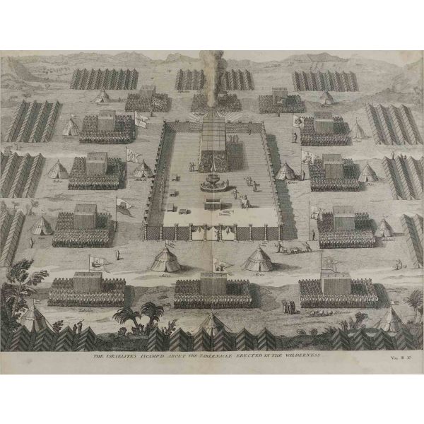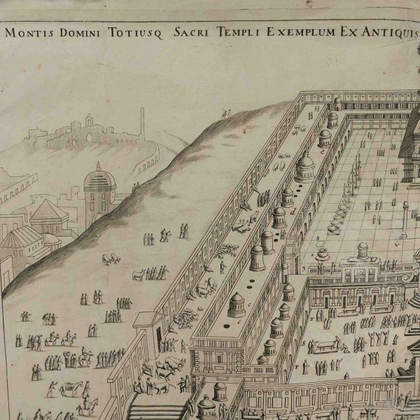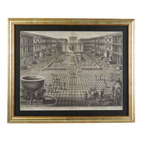 İsrailoğullarının Kurbanlarını Kutsal Tapınağa getirişleri, kutsal tapınak avlularında yerleşmeleri ve kurbanlar ile beraber sırlarını beklemeleri, çobanlık edişlerinin sembolize edildiği, Kutsal Tapınaktan kısımlar, çeşmeler mevcuttur. Görselin sağında Hz. Süleyman´ın babas Kral Davud´un yaptırdığı kule görülmektedir. Çok nadir gravür, S/B...