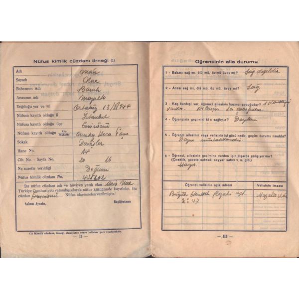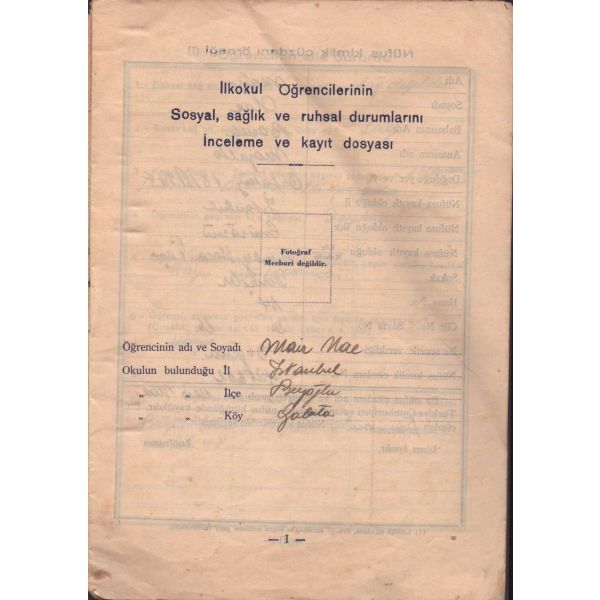 Arka kapak iç yüzüne ilişik zarf içinde ise Mair Nae´ye ait noter tasdikli nüfus sureti, Milli Eğitim Müdürlüğünün okula hitaben yazısı ve Mair Nae´nin direk üçüncü sınıfa alınması ile ilgili talep yazısı mevcuttur.