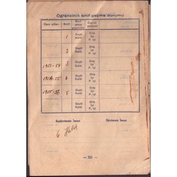 Dosyanın arka sayfası 3 senelik karne içermekte olup, okul başöğretmeni G. Habib ıslak imzalıdır.
