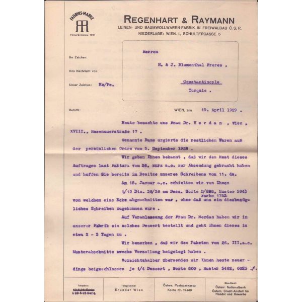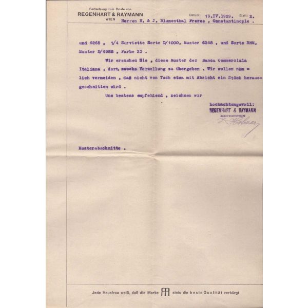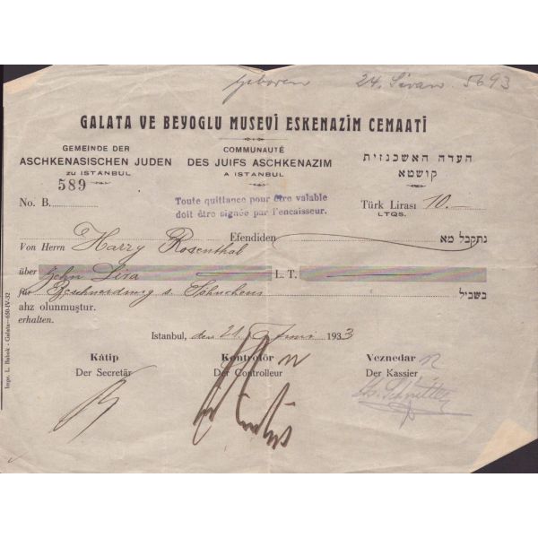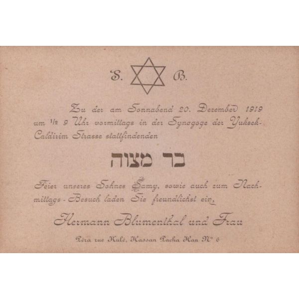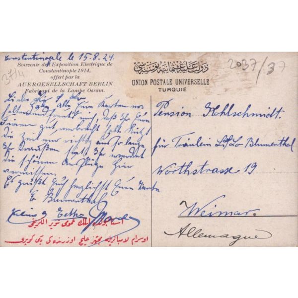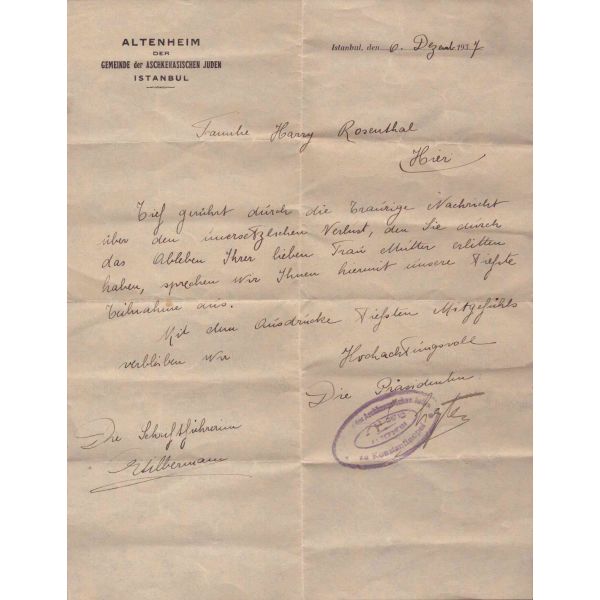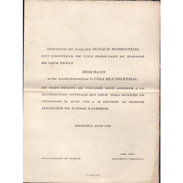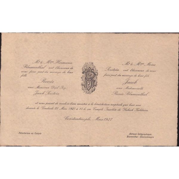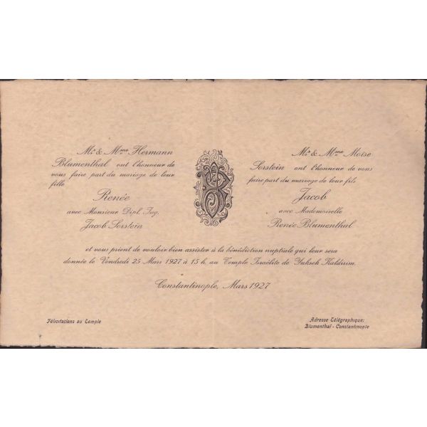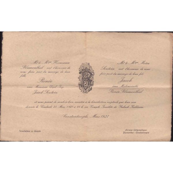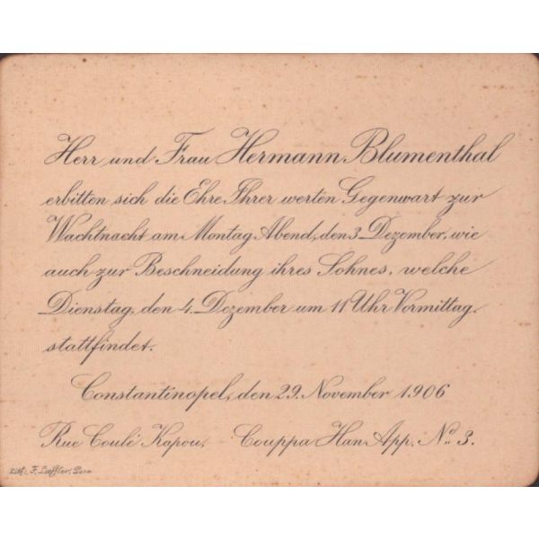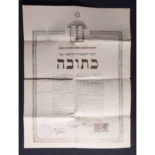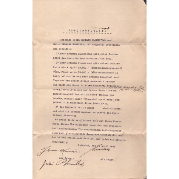 Evlilik sırasında verilmiş olan bu doküman Blumenthal ve Hermann tarafından imzalı ve yetkililer tarafından onaylıdır. Normalde matbu olarak çıkan bu belge, el yazılı olup nadirdir.