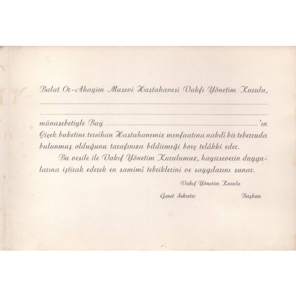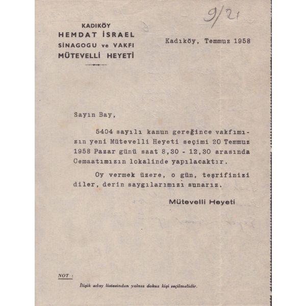 Hahambaşılık ile Or-Ahayim vakıfları mütevelli heyet seçim bildirisi (filigranlı kâğıt),