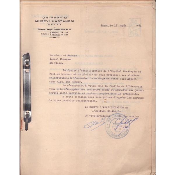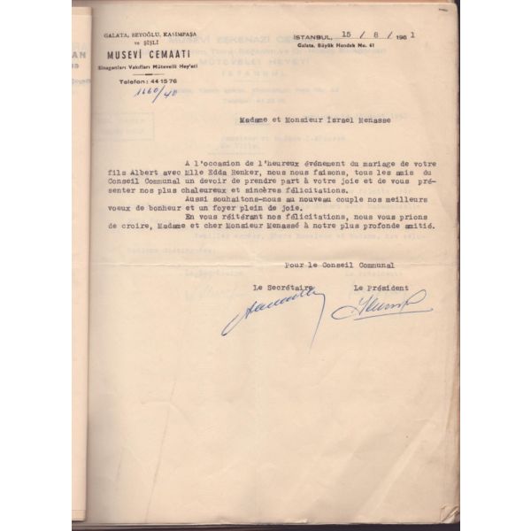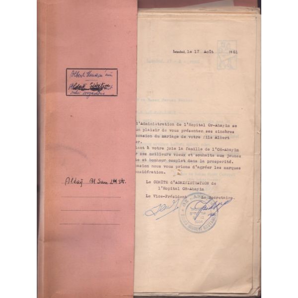 Dosya içerisinde İsrael oğlu Albert´e Lübnan´da faaliyet gösteren College du Sacre-Coeur tarafından gönderilen tebrik yazısı da bulunmaktadır.