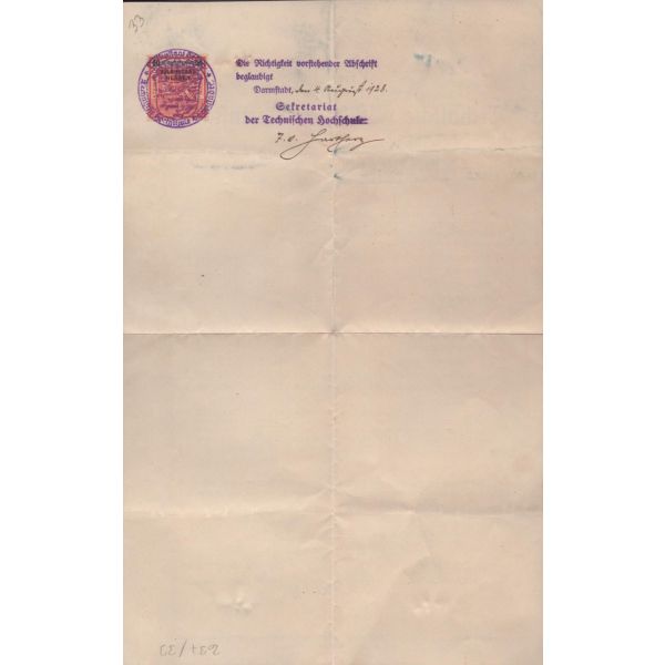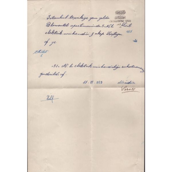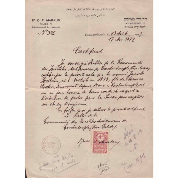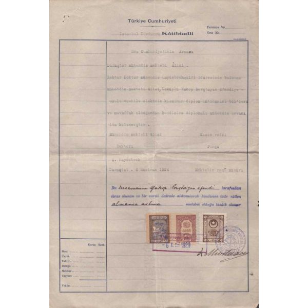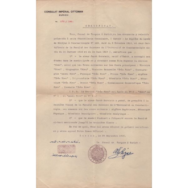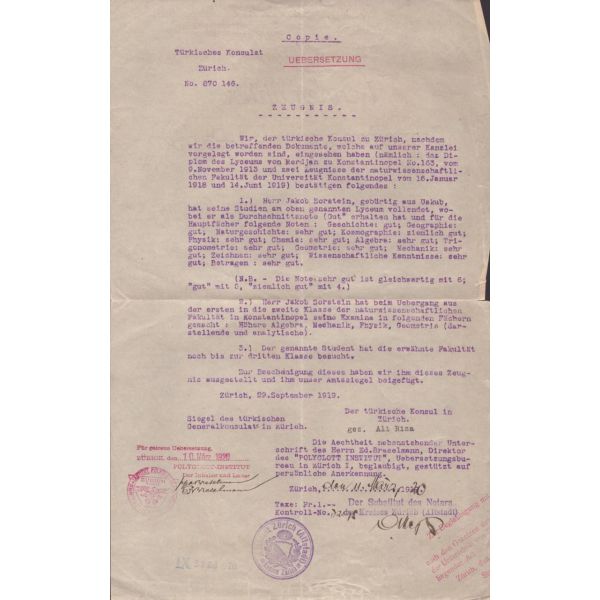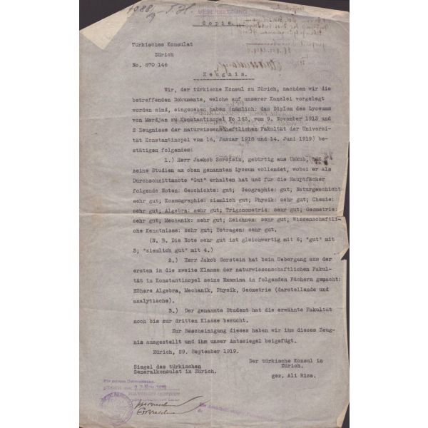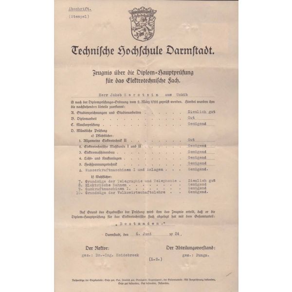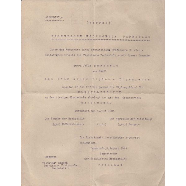 TC Nafia Vekaleti Yüksek Mühendis Mektebi tarafından yazılmış, 1924 tarihinde Jacob Sorstein´ın Darmstad Teknik Üniversitesi´nde tahsilini bitirerek diplomayı istihsal eylediğini ve elektrik mühendisi ünvanını Türkiye Cumhuriyeti dahilinde sanat etmeye mezun bulunduğunu bildirir belgedir.