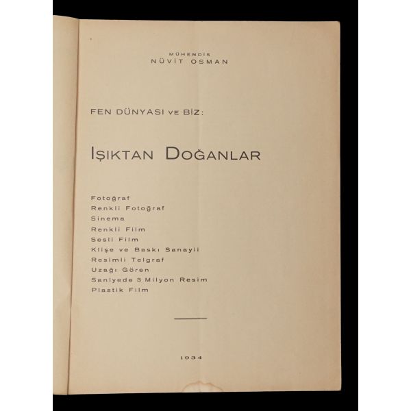 Mühendis Nüvit Osman´ın, fotoğraf başta olmak üzere sinema, resimli telgraf ve klişecilik gibi alanlara dair teknik bilgileri zengin görseller eşliğinde derlediği çalışması. *Ön kapağın yarısı sırttan ayrılmıştır.