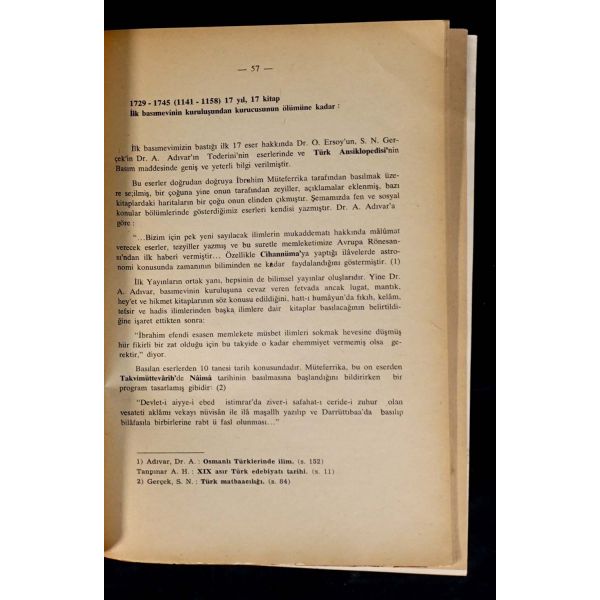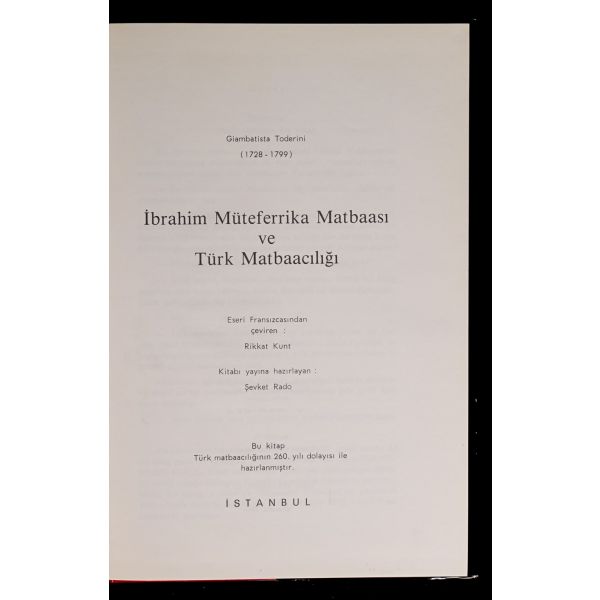 Giambatista Toderi'nin, 1787 yılında yayımladığı, Müteferrika Matbaası hakkında yazılmış ilk eser olma niteliği taşıyan "Letteratura Turchesca" adlı eserinin Şevket Rado tarafından yayımlanan Türkçe ilk basımı...