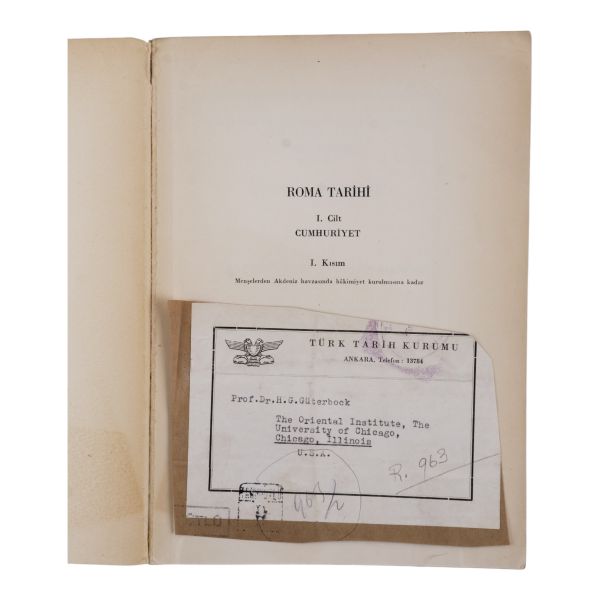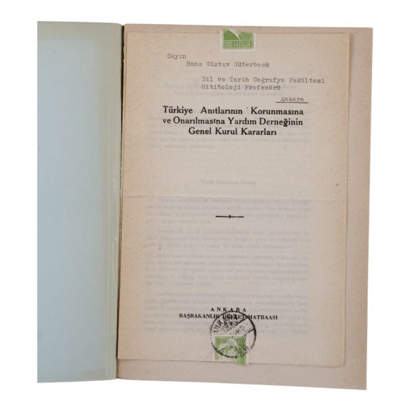 İçinde "Dil ve Tarih Coğrafya Fakültesi Hititoloji Profesörü" Hans Güstav Güterbock adına postalanmış (pullu, damgalı); "TÜRKİYE ANITLARININ KORUNMASINA VE ONARILMASINA YARDIM DERNEĞİNİN GENEL KURUL KARARLARI" başlıklı metin yer almaktadır.