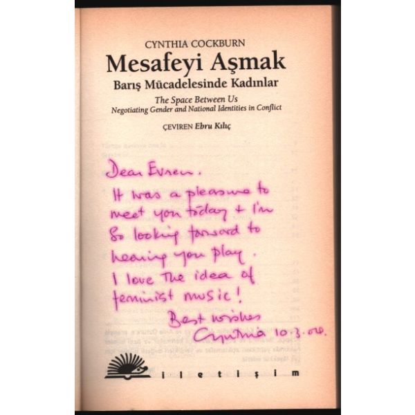 İmza okunamasa da Cynthia Cockburn´a ait olduğunu düşündüğümüz İngilizce ithaf şu şekildedir: "Dear Evren, It was a pleasure to meet you today + I´m so ... to heaving you play. I love the ideo of feminist music! Best wishes ... 10.3.04"