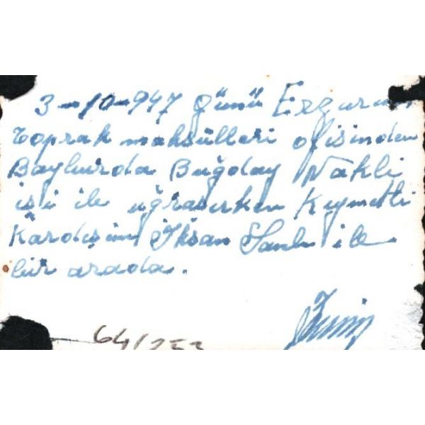 "3-10-947 günü Erzurum toprak mahsülleri ofisinden Bayburda buğday nakli işi ile uğraşırken Kıymetli Kardeşim İhsan Sanlı? ile bir arada. Emin"