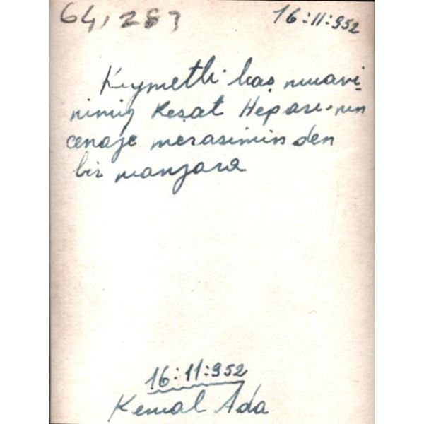 "16.11.952 Kıymetli baş muavinimiz Reşat Heparı´nın cenaze merasiminden bir manzara. Kemal Ada"