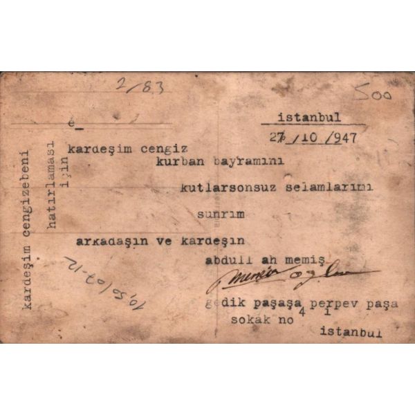 Daktiloyla kaleme alınan bayram tebriği, "İstanbul 27/10/947 Kardeşim Cengiz, Kurban Bayramını kutlar, sonsuz selamlarımı sunarım. Arkadaşın ve Kardeşin Abdullah Memiş." şeklindedir.
