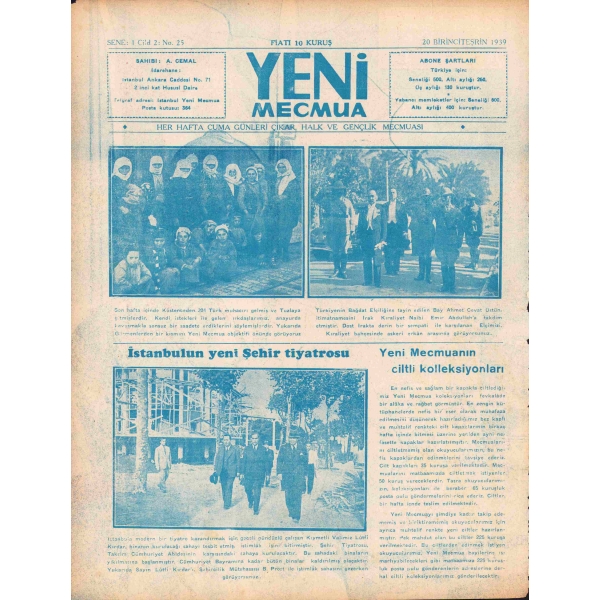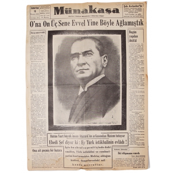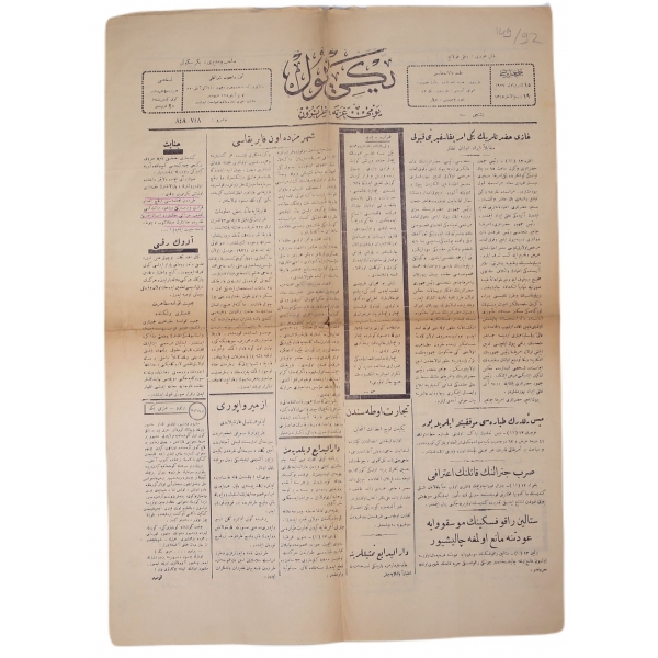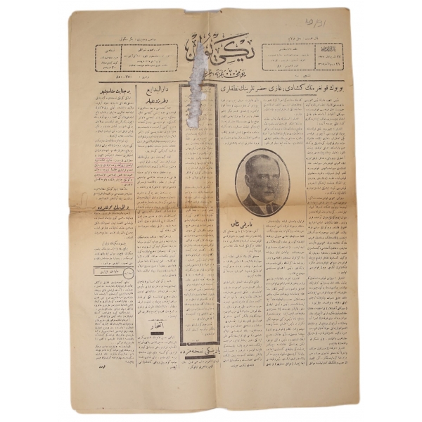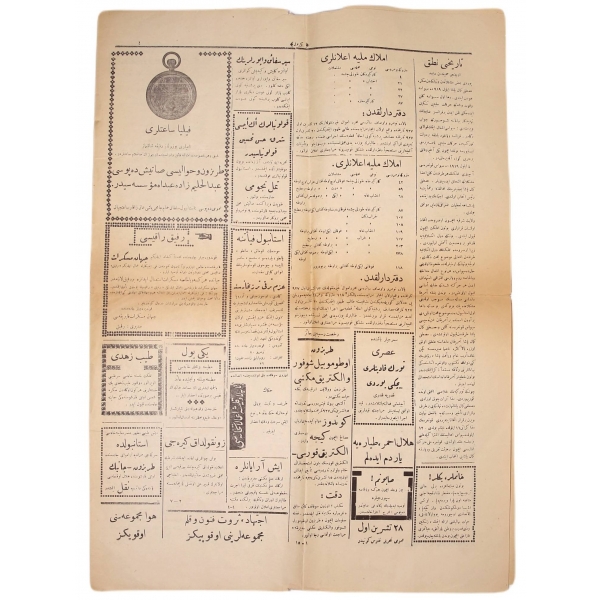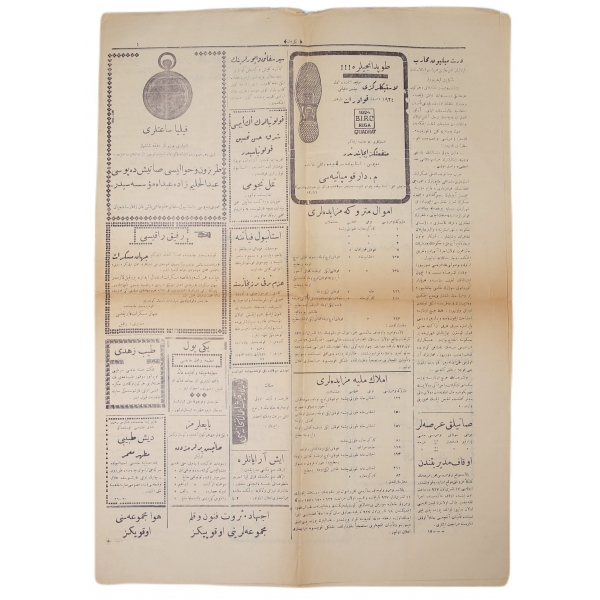 haliyle, 4 sayfa, 40x56 cm, arkası bol reklamlı, "Filiya Saatleri", "Toptancılara !!! B.I.R.C 1924 Lastikleri"